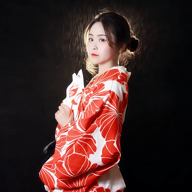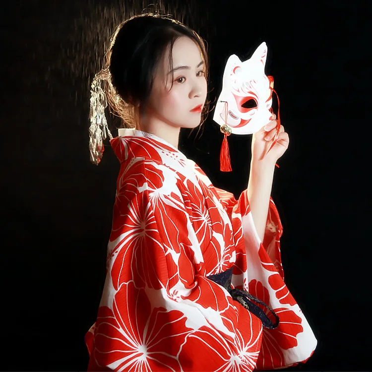 Женское японское традиционное кимоно, красное винтажное платье юката с цветочным принтом, платье для сцены, одежда для костюмированной вечеринки