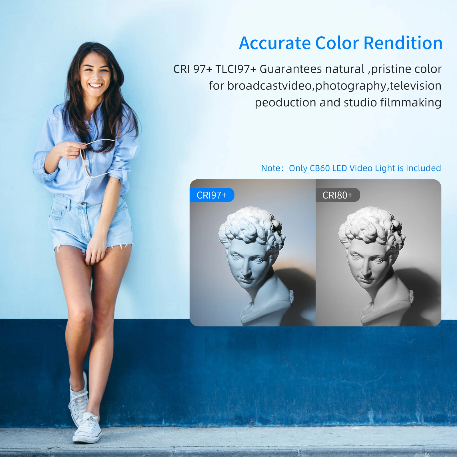 CB60-это мощный светодиодный светильник, который производит 60 Вт непрерывный светильник для фотосъемки и видеосъемки. Его 5600K Дневной свет держит все ваши снимки в равномерной цветовой температуре, а 97 + ультра-высокий CRI и TLCI обеспечивают аутентичную цветовую производительность.