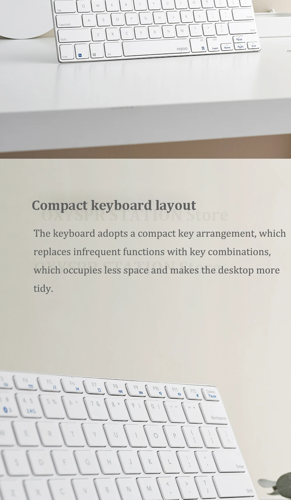6, компактная раскладка клавиатуры: клавиатура имеет компактное расположение клавиш, которое заменяет нечастые функции с комбинациями клавиш, что занимает меньше места и делает рабочий стол более аккуратным.