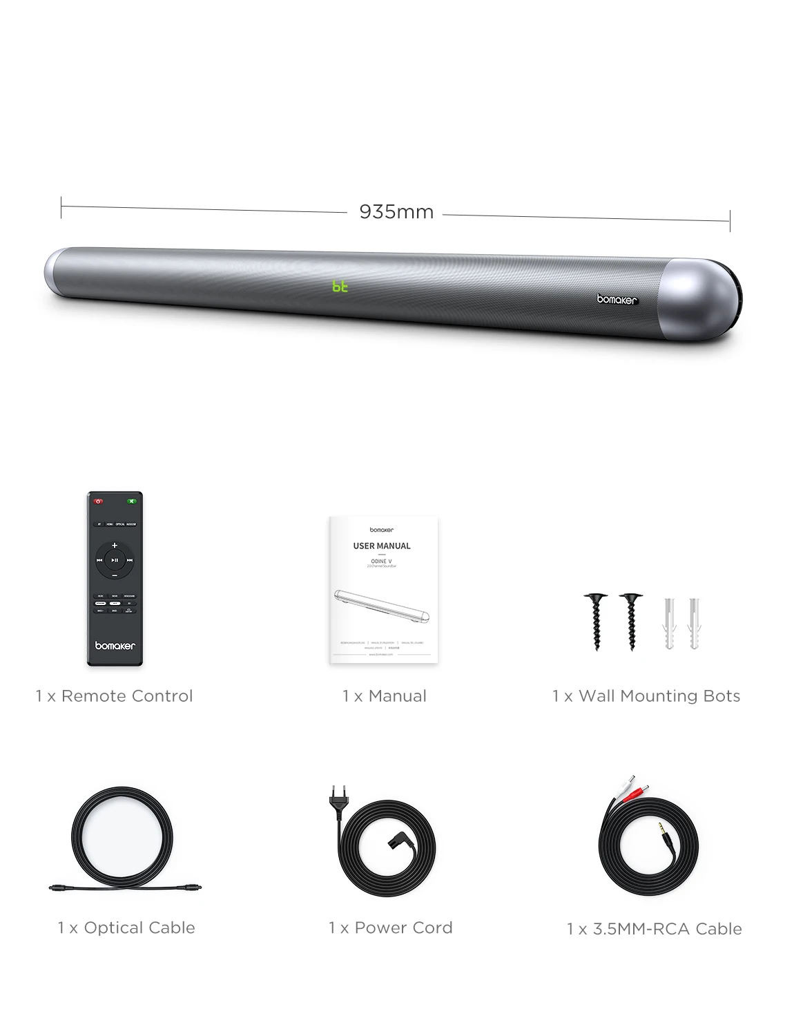 6 + 2 EQ MODES: 6EQ modes: 3D, Bass +/-, Music, Movie, News, Game. Thanks to the specially developed listening style: Dynamic / HiFi, Bomaker Odine V Soundbar is more compatible with different televisions.