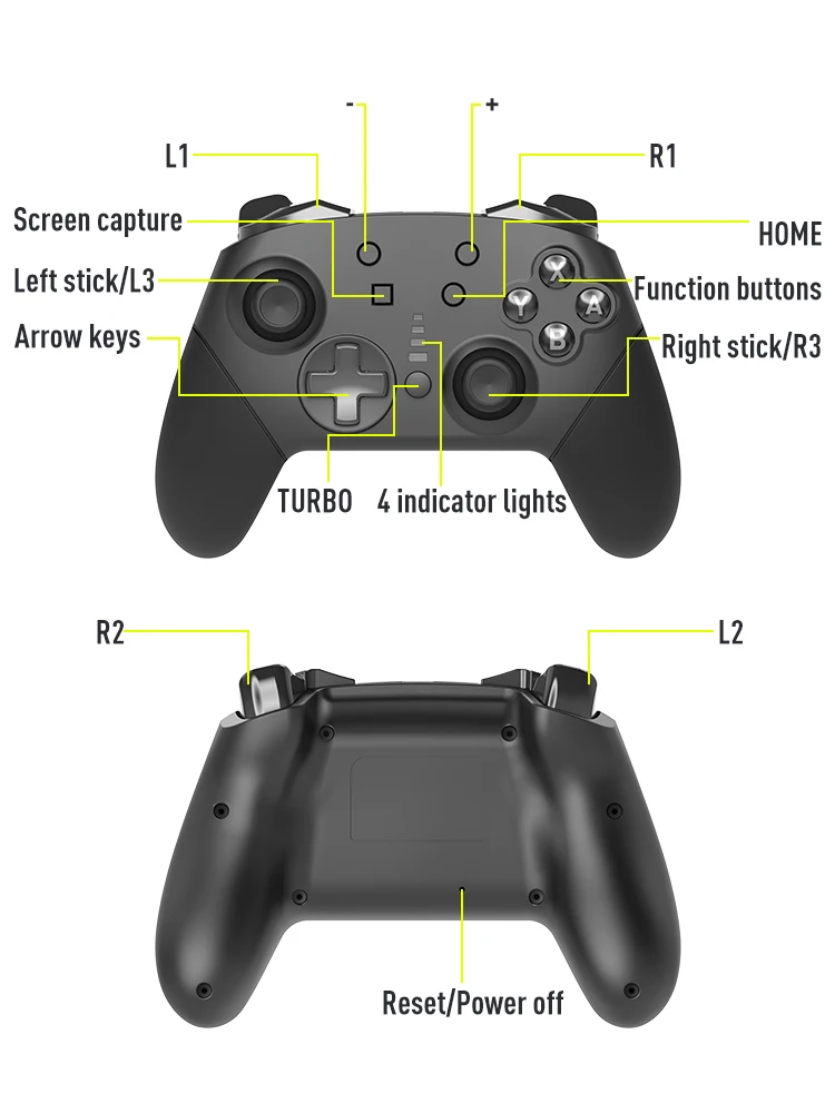 Подключение контроллера к хосту в первый раз: Включите хост коммутатора, на интерфейсе главного меню хоста, нажмите и удерживайте кнопку «контроллер» → «изменить рукоятку», чтобы войти в Интерфейс режима сопряжения хоста; На контроллере нажмите и удерживайте кнопку «домой» Кнопка в течение 4 секунд включит контроллер, четыре светодиодный лампы будут мигать медленно и циклически сначала, а через 4 секунды они быстро и циклически мигать и войти в состояние поиска. Когда один (или более) светодиоды длинные, контроллер и хост успешно сопряжены. Нажмите кнопку «B», чтобы вернуться к интерфейсу главного меню.