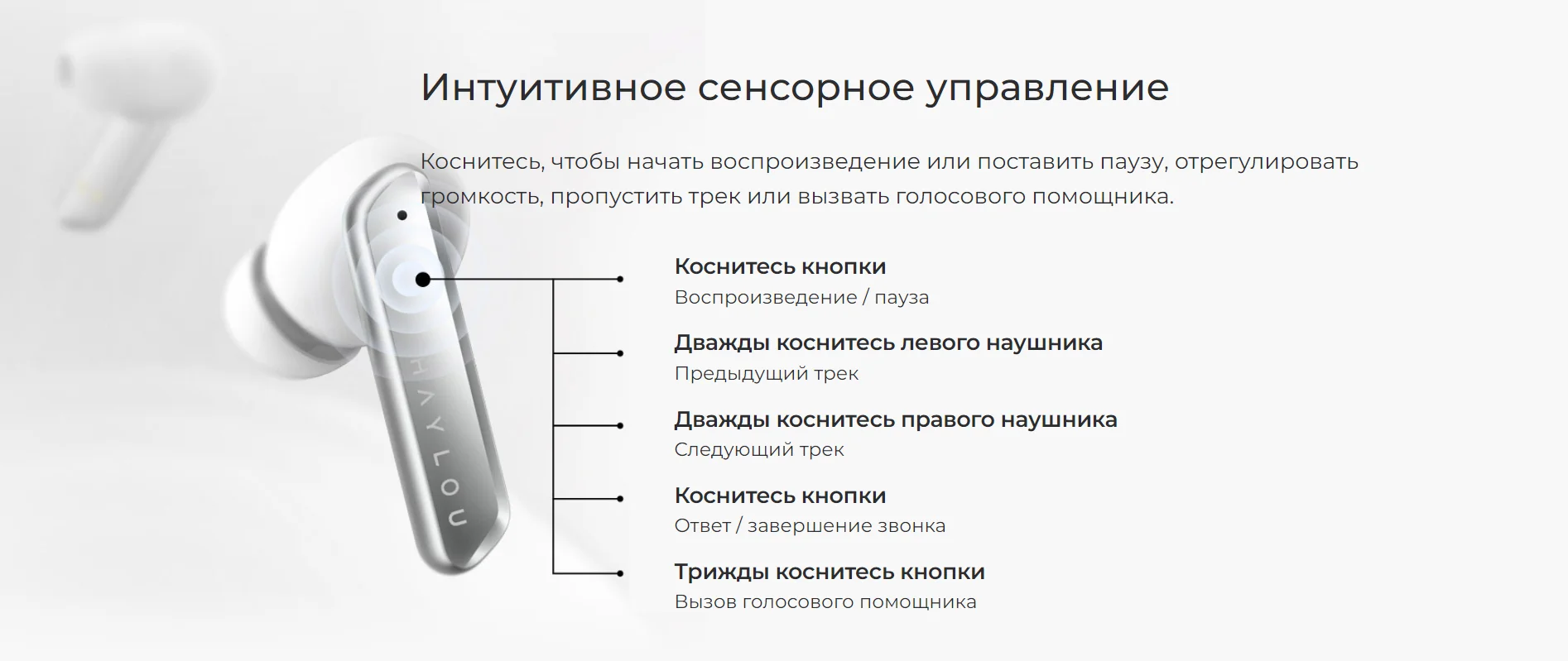 На внешней стороне корпуса Xiaomi Haylou W1 расположена сенсорная панель. С ее помощью вы можете выполнять многие действия, даже не взяв смартфон в руки – нужно всего лишь осуществить несколько касаний для выполнения нужной функции.