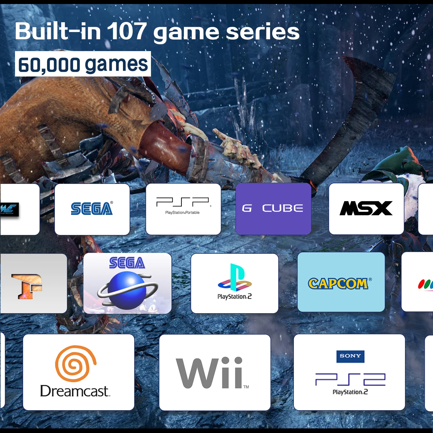 Built-in 60,000+ retro games, including 6000 3D games.Support for Saturn/G Cube/PS2/N64/DC,etc.