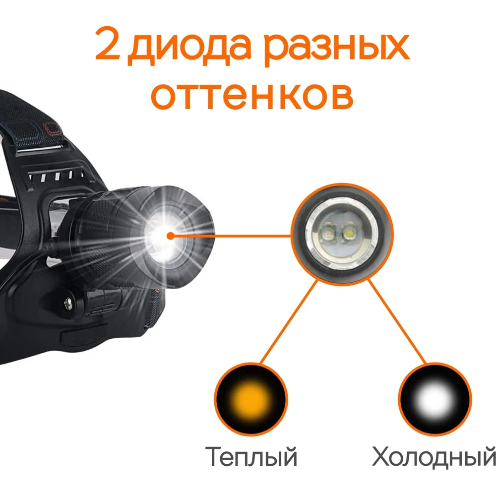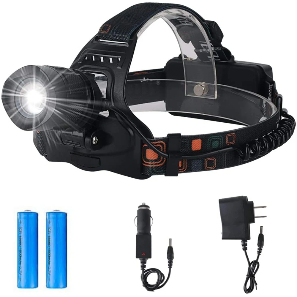 Headlamp powerful LED flashlight zoom adjustable angle light with built-in rechargeable batteries, warm and cold light car 12 V charging kit, 4 modes