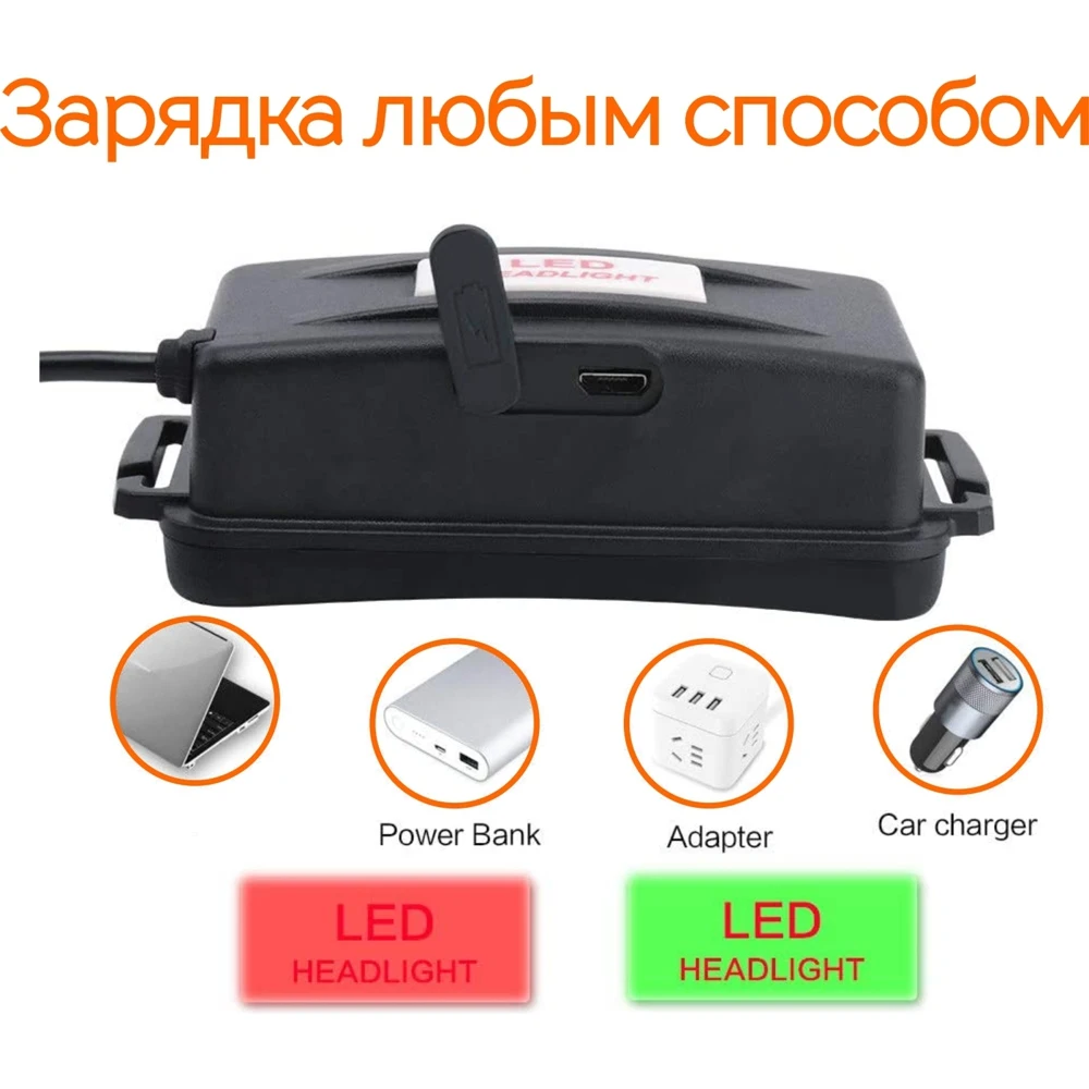 Activation of the lantern occurs by pressing the power button on the right. The battery pack is located on the back of the head, connected by a spiral wire on the left side. Has a rubber lining that prevents moisture and dust from entering the battery.
