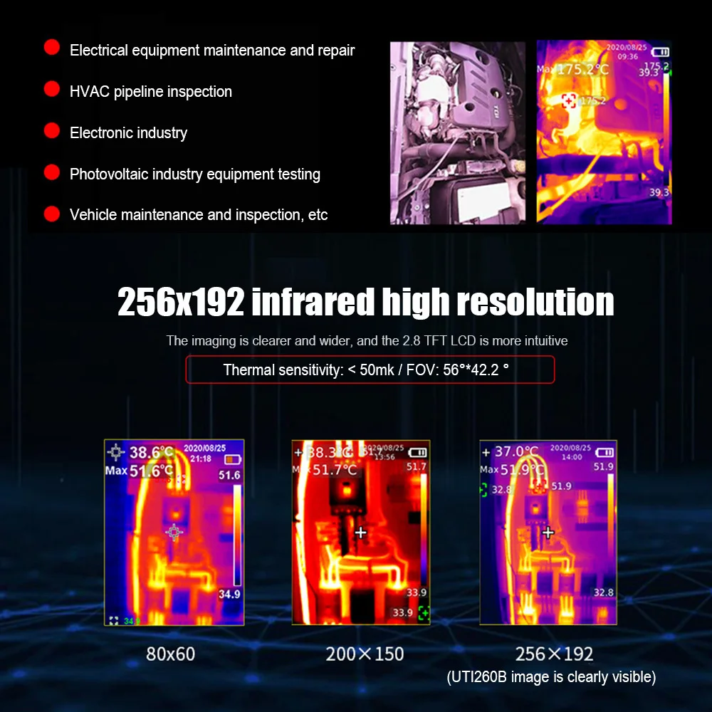 UTi260B-это Инфракрасный Тепловизор, который сочетает измерения температуры поверхности с тепловыми изображениями в реальном времени, которые четко отображаются на экране тепловизором. Объектив с инфракрасным и видимым светильник, два вида, -15 ℃ ~ 550 ℃ температурный диапазон, тепловое изображение 256x192 пикселей (49152) которые с большей вероятностью обнаружат ненормальные температурные точки. Сфотографируйте и храните его на своей карте памяти, затем вы можете использовать программное обеспечение ПК для анализа и обработки изображений для создания отчетов и оснащен программным обеспечением для ПК, функцией проекции экрана в реальном времени, с уровнем защиты IP65, приходите и попробуйте, это не подведет вас.