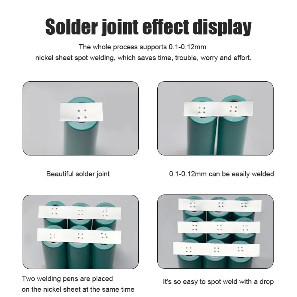 Эффективное сварочное оборудование: портативный точечный сварочный аппарат в основном используется для сварки никелевого листа цилиндрической батареи, такой как 18650. Встроенный высокочастотный полимерный блок питания, и он может непрерывно сваривать тысячи точек после полной зарядки.