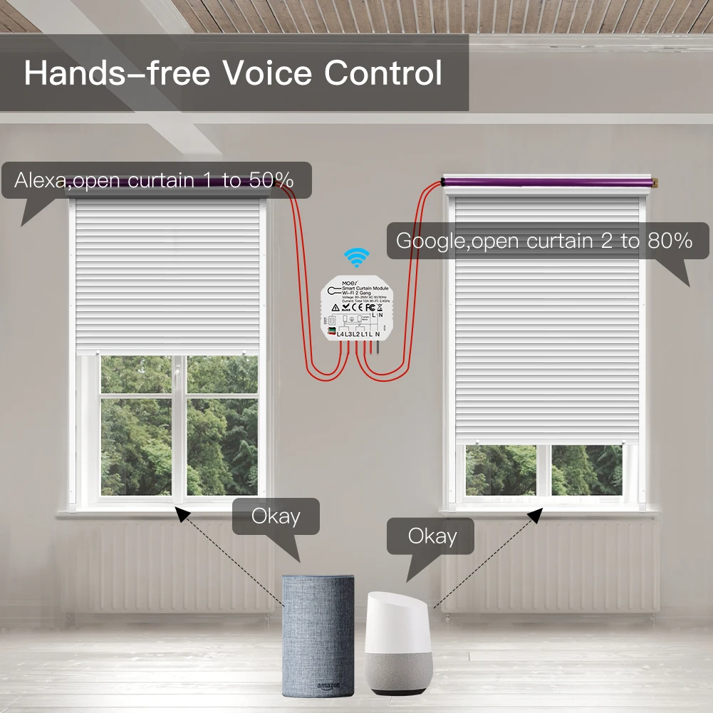 2. Удаленное управление устройствами с вашими смартфонами через приложение smart Life и Tuya, где бы вы ни находились; Совместимость с Amazon Alexa, Google Home позволяет осуществлять Голосовое управление без рук с подключенными устройствами; процент регулируется для каждого занавеса в приложении.