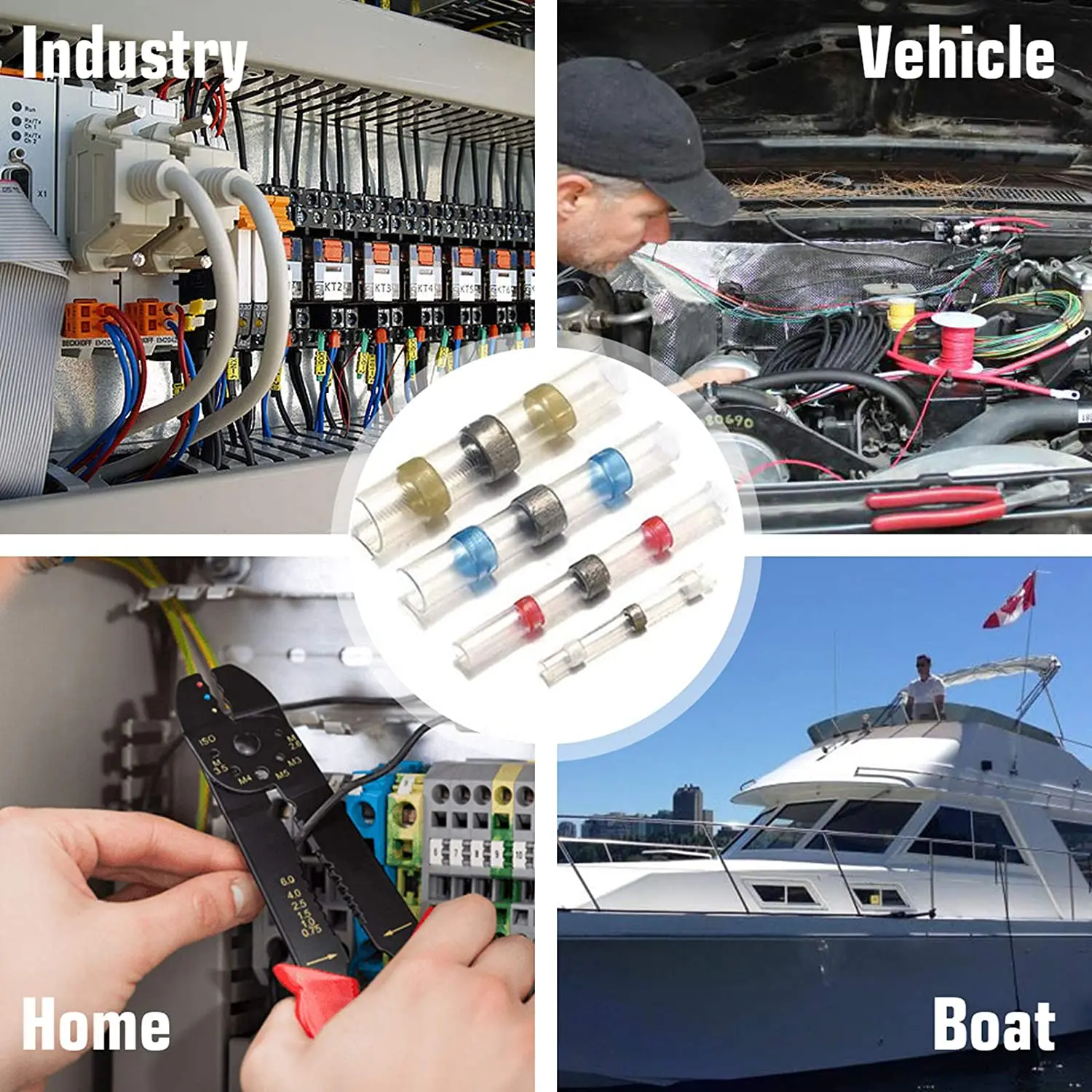 Простота идентификации-область применения цветовых кодов этих термоусадочных трубок позволяет легко выбрать для правильного применения. Вы можете проверить таблицу размеров в коробке продукта, измерить провод и выбрать правильный разъем. Эти термоусадочные трубки могут быть использованы в широком диапазоне площади. Из-за Высокой водонепроницаемости, эти трубы обычно предпочтительны в автомобильном, а также в морском секторе. Соединительные соединители для припоя также могут использоваться в доме и школе.