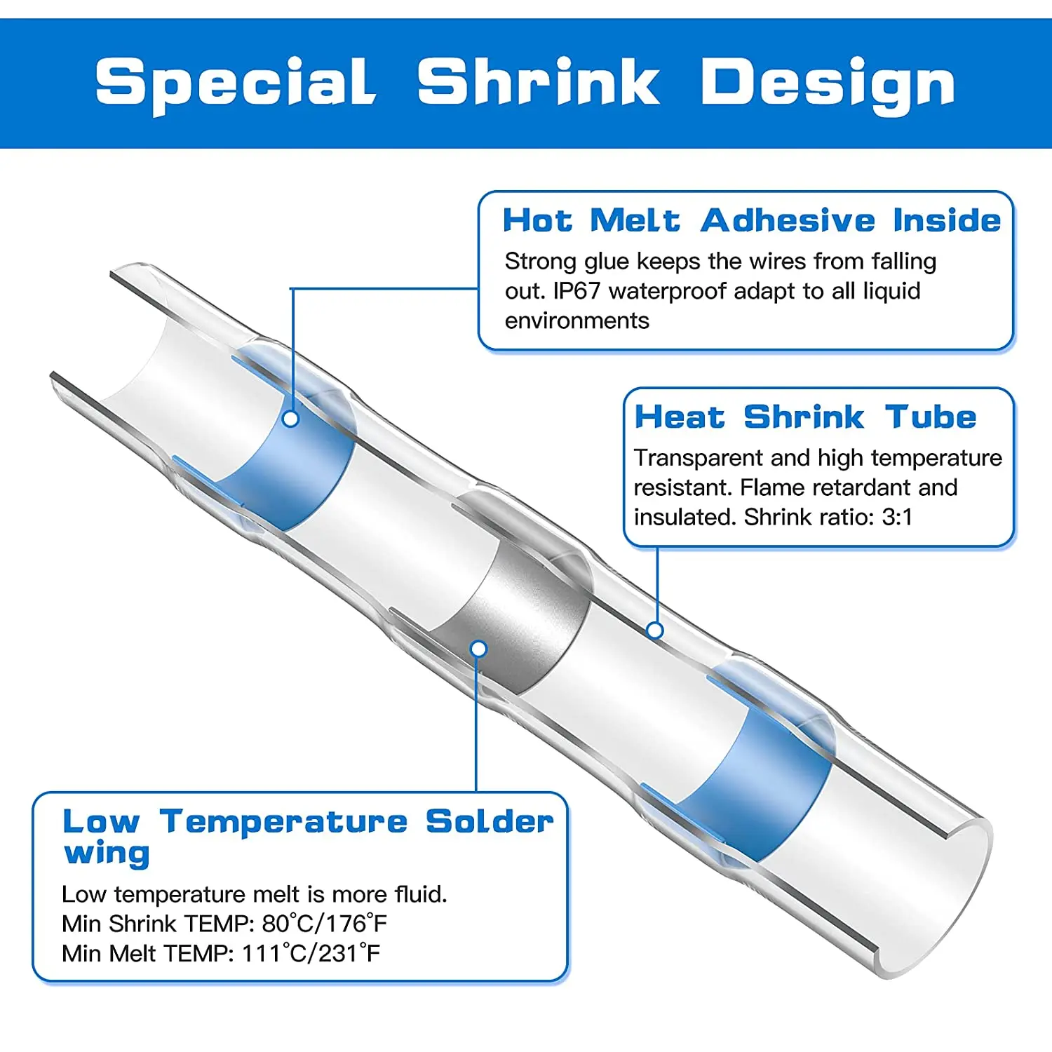 Предотвращают ожоги термоусадочной трубки сильнее и прочнее, предотвращают сжигание трубки NoraTech, предотвращают ожоги и плавление припоя. Стыковые соединители для припоя и уплотнения изготавливаются во избежание ожогов или плавления во время нагрева.
