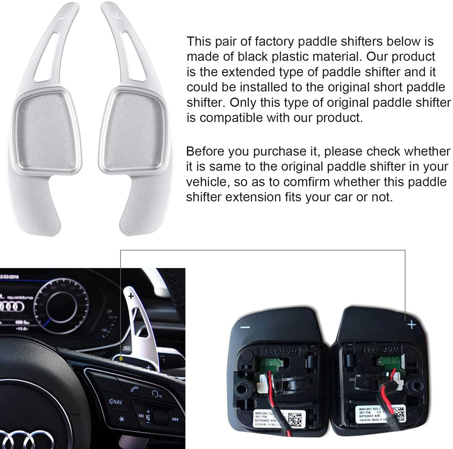 Отличная совместимость:Наши рулевые весла подходят дляAudi A3 A4 A5 S3 S4 S5 SQ5 Q5 Q7 Q8 TT TTS (пожалуйста, обратитесь к описанию продукта для соответствующих лет) Высокое стандартное качество:Изготовлен из высококачественного алюминиевого сплава с Матовой серебряной поверхностью; Высокая прочность, не выцветает, не ржавеет Отличная функция:Сдвижное весло, как быстрое переключающее устройство, может значительно улучшить работу вождения, так что это помогает водителю быстро завершить переключение Простая установка:Установка за считанные минуты с самоклеющейся лентой 3 м, сидит достаточно плотный и приятный 100% гарантия соответствия:Мы стремимся предоставить нашим клиентам лучшие продукты и услуги. Если вы не на 100% удовлетворены нашим веслом для сдвига, просто верните его для полного возврата денег в течение 30 дней. Премиум поддержка и гарантия 12 месяцев