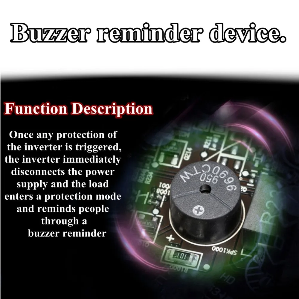 -Устройство напоминания зуммера. Как только срабатывает Любая защита инвертора, инвертор немедленно отключает источник питания, а нагрузка входит в режим защиты и напоминает людям через звуковой сигнал