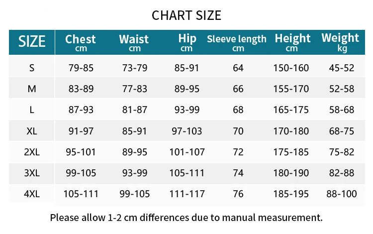 4XL: талия 99-105 см, обхват груди 105-111 см, обхват бедер 111-117 см, рост 185-195 см, вес 88-100 кг, длина рукава 76 см,