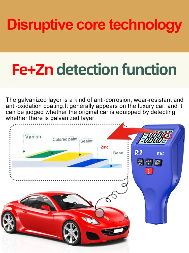 R & D ET360 магнитные Толщиномеры для автомобилей 0,1 um Fe/NFe Fe + Zn высокая точность авто Paintwork Probe Test Meter