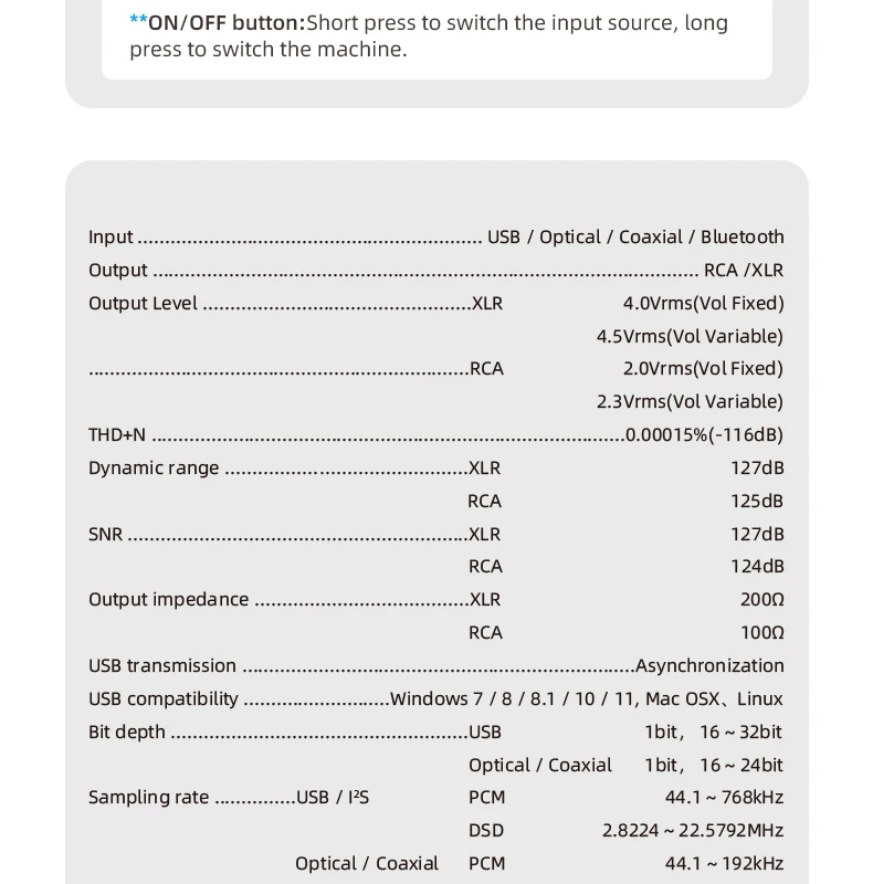 USB использует XMOS XU-208, истинное usb-решение 32 бит, PCM поддерживает до 768 кГц, а DSD поддерживает до DSD512.