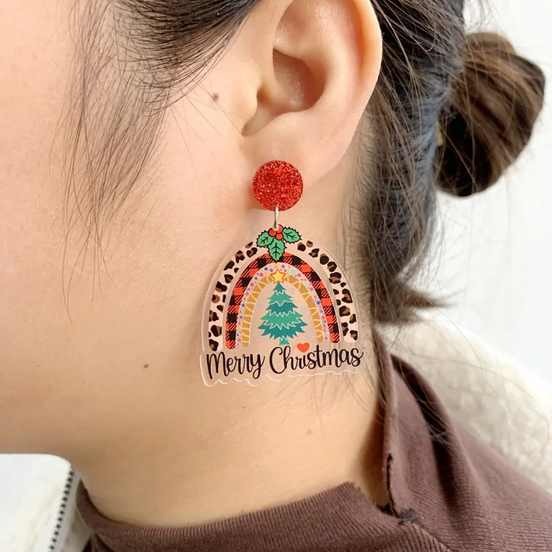 Милые Праздничные рождественские красочные радужные леопардовые принты, Рождественская елка и прозрачные лампочки, акриловые серьги-гвоздики