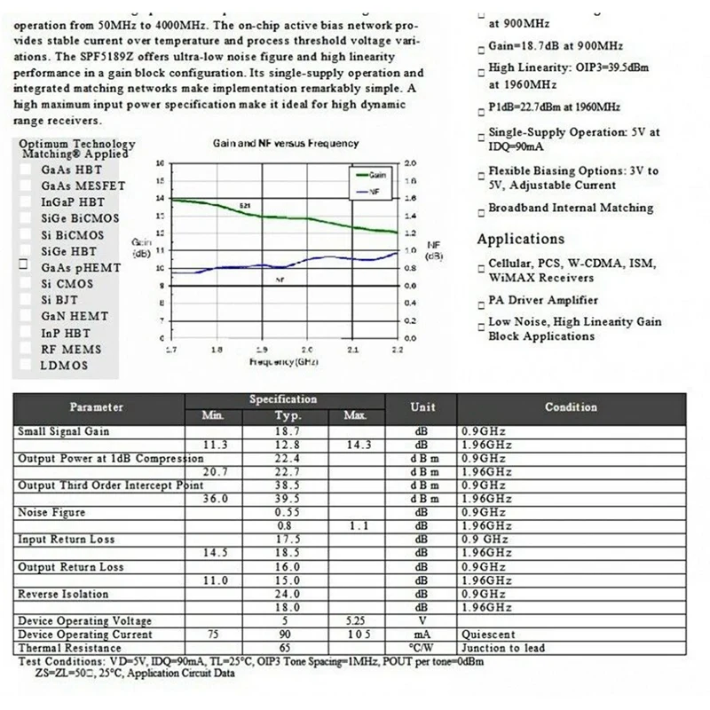 2. Gain: Typical 18dB @ 0.9G Input/Output Impedance: 50 Ohms