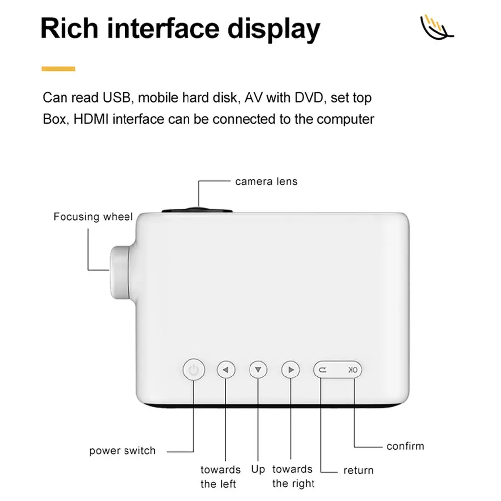 Этот проектор поддерживает изображения высокой четкости и четче, позволяя вам и вашей семье и друзьям испытать живые игры, и вы также можете почувствовать эффекты кинотеатра дома.