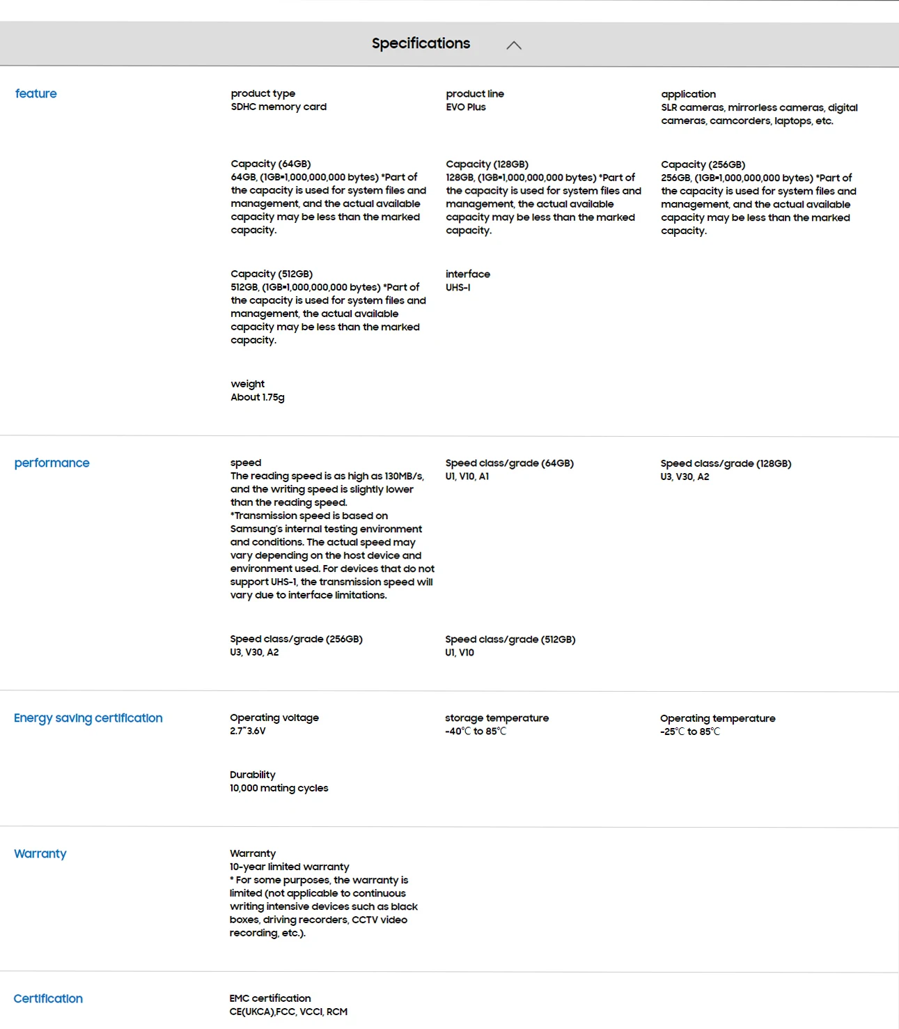 3. Номинальное значение относится к картам памяти 128 ГБ и 256 ГБ. Карты памяти 32 ГБ и 64 ГБ-Класс A1, V10, UHS-I.