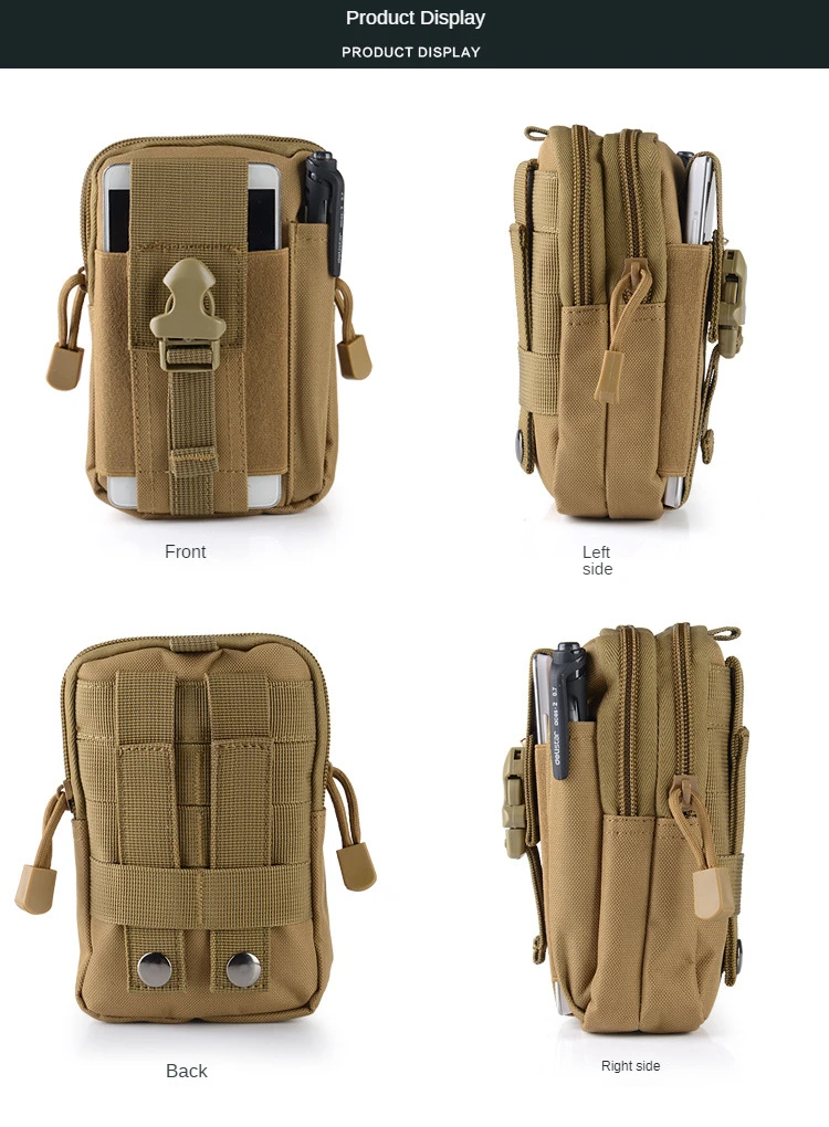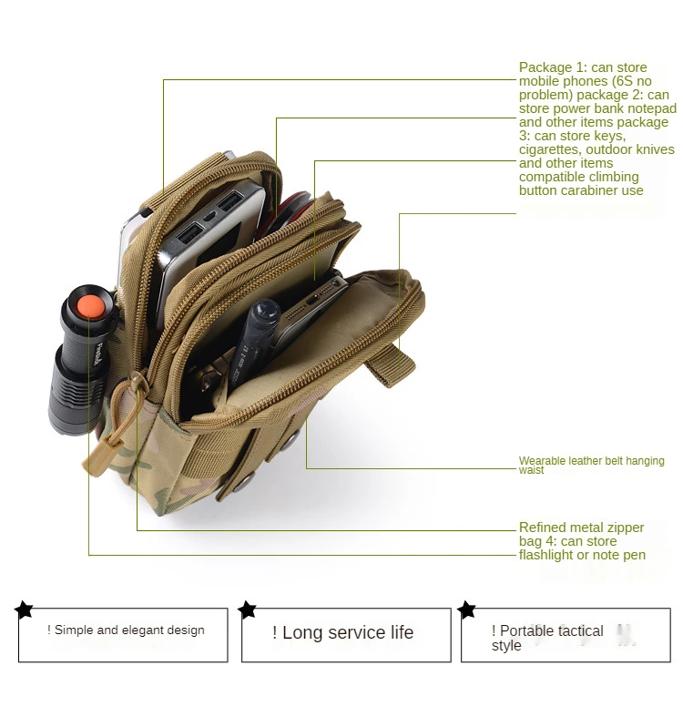 Компактный и большой емкости. Может переносить мобильные телефоны, ручки, сигареты, кошельки, карабины, цифровые камеры, телефон, прикуриватель, Мобильная мощность, портативный фонарик, инструменты, Gps разработка и другие предметы кемпинга.