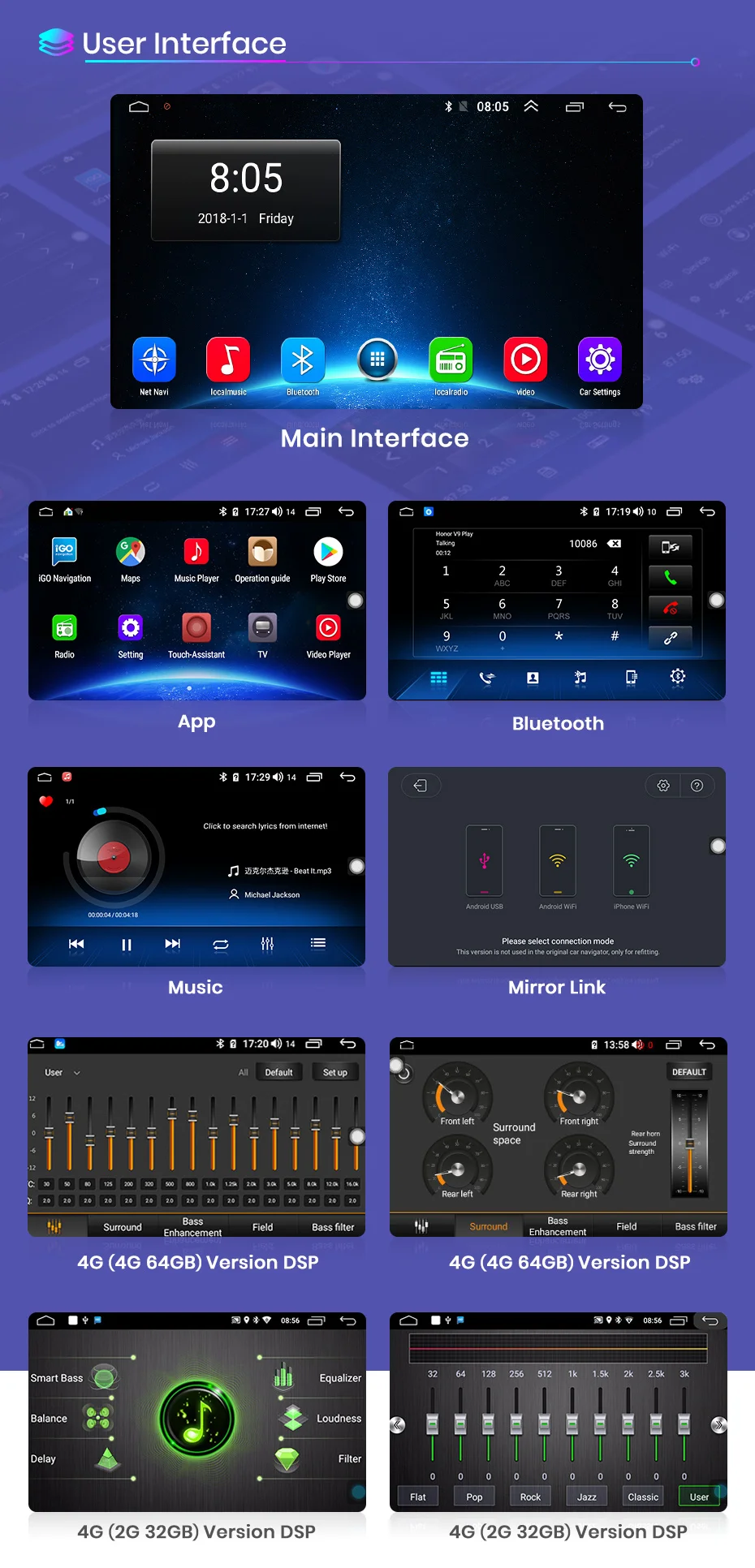 >> 9 inch 2.5D Capacitive Screen + Quad Core 1.2GHZ CPU + DDR3 1GB /2GB / 4GB Flash ( optional) + 16GB /32GB / 64GB Memory ( optional) + Built-in Wifi (4G Network optional) + GPS Navigation (Map free update)+ Steering Wheel Control + Mirror Link + Bluetooth-compatible+ Built-in Microphone + FM/AM + RDS + support USB DVR ADAS + support Europe DAB Function + 1080P Video Play + HD 1024*600 + support Tire Pressure Monitoring System