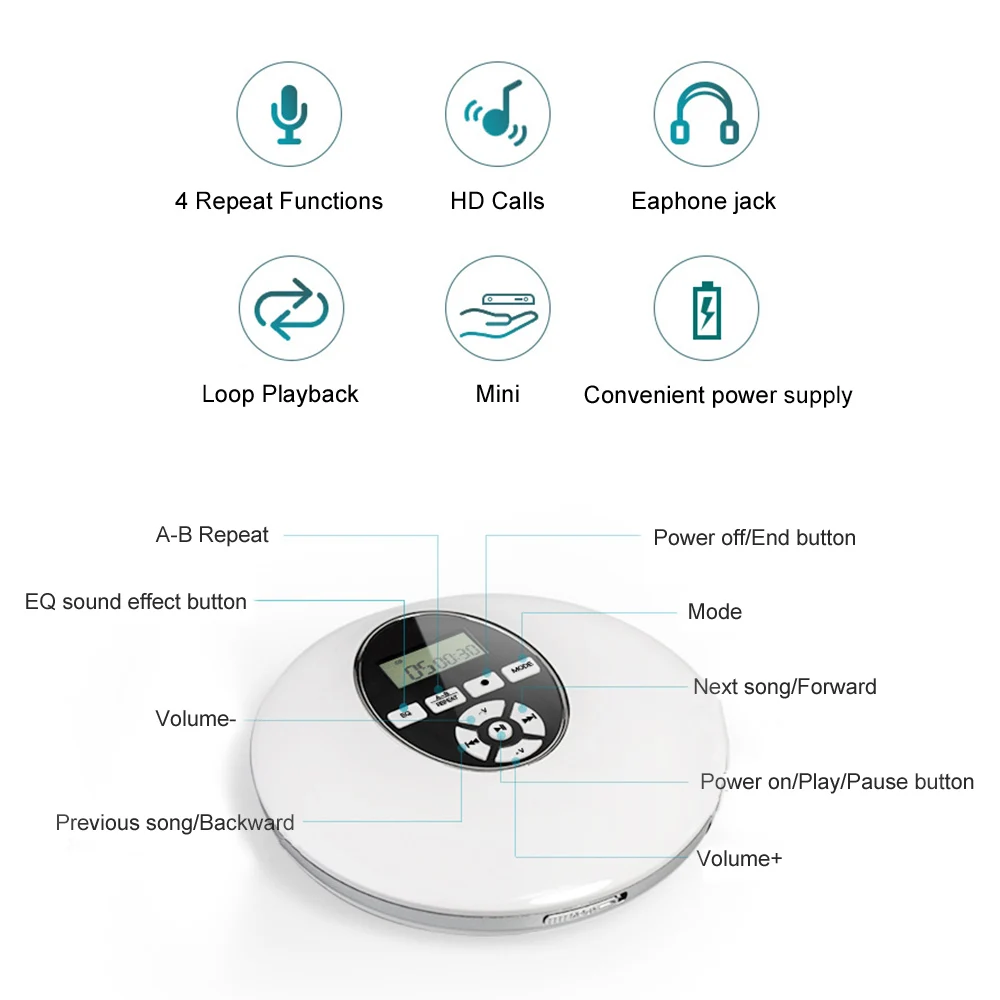 Features:<;br/>Widely compatible with CD, CD-R, CD-RW, MP3, WMA and CD-DA. First class sound source decoding makes the sound quality better.<;br/>CD Play &TFCard Play two modes for you to choose. 5 Sound Effect: BBS, JAZZ, POP, ROCK, ORIGINAL; 4 Repeat Functions: A-B Repeat &Repeat1 &RepeatAll &Playin random order. ASP: anti-shock system to prevent interruption of CD playback in case of vibration.<;br/>With LCD display screen, it is convenient to understand the current playing mode.<;br/>With multi-function buttons on the top, it is easy to operate.<;br/>AUX connected with all audible devices 3.5mm audio input, like connecting the speaker or headsets or car audio, this CD player gives you more choices to enjoy your favorite Music.<;br/>Portable design, small and lightweight, at home, it can be powered with the included USB cable or powered by 2*AA batteries(not included), convenient for outdoor use.<;br/>Specifications:<;br/>Type: CD Player<;br/>Material: ABS<;br/>Color: Black/White(Optional)<;br/>Support disc formats: CD, CD-R, CD-RW, MP3<;br/>Support music formats: CD-DA, MP3, WMA<;br/>Output power: 20mw<;br/>Battery: 3V 2*AA battery(Not included)<;br/>Signal Noise Ratio: ≥80dB<;br/>Distortion: <;1%<;br/>Input: AC 110-220V<;br/>Output: DC 5V 1A<;br/>Package Size: 17*17*4.5cm / 6.7*6.7*1.8in<;br/>Package Weight: 435g / 15.3oz<;br/>Package List:<;br/>1 * CD Player<;br/>1 * 3.5 to 3.5mm AUX cable<;br/>1 * USB Power Cable<;br/>1 * User Manual