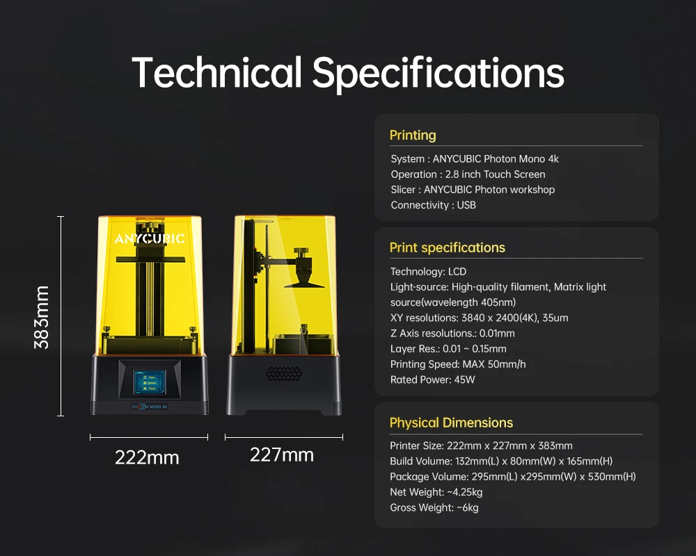 Моно 4K имеет 3840 × 2400 разрешение печати, 35um XY pixelsand 7% светильник пропускания, который может доставить очень подробные принты. Холостые-слой время отверждения составляет всего 1,5 секунд, и скорость печати может достигать 50 мм/час.