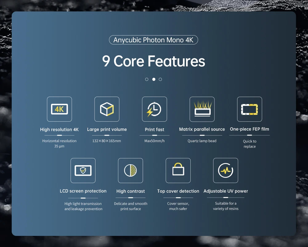 9 основных функцийL Высокое разрешение 4K (6,23 "Монохромный экран)L большой объем печати (132 × 80 × 165 мм)Быстрая печать (макс. 50 мм/ч)L Регулируемая УФ-мощность (подходит для различных смол)L матрица параллельного источника (кварцевый шарик лампы)L высокая контрастность (тонкая и гладкая поверхность печати)Защита ЖК-экрана (высокий светильник и предотвращение утечки)L цельная пленка FEP (быстрая замена)L Обнаружение верхней крышки (датчик крышки, гораздо безопаснее)
