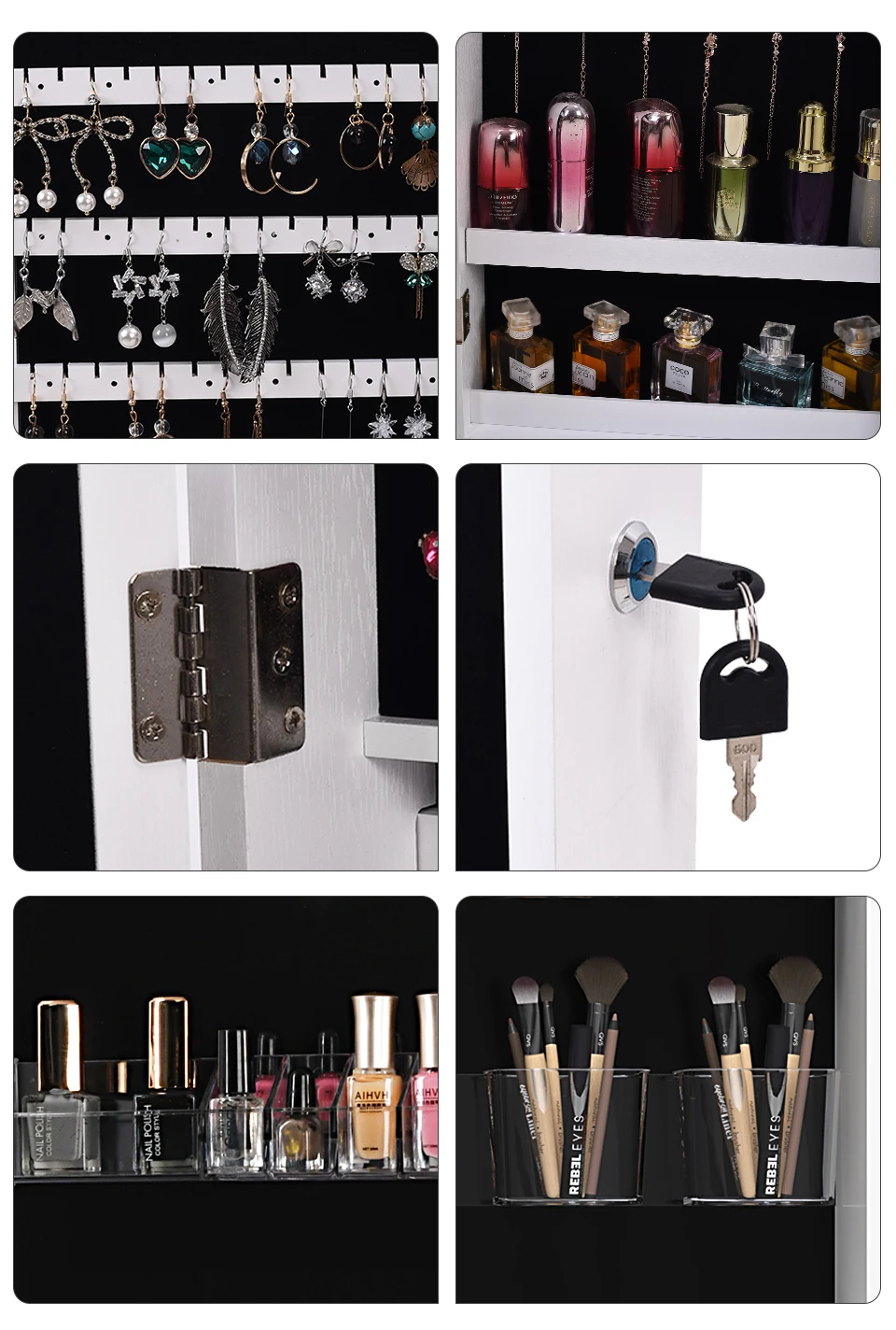 Без хлопот-поставляется в комплекте с дверными вешалками, винтами и инструкциями. Вы будете иметь свободу, чтобы разместить свой ювелирный шкаф везде, где вы хотите
