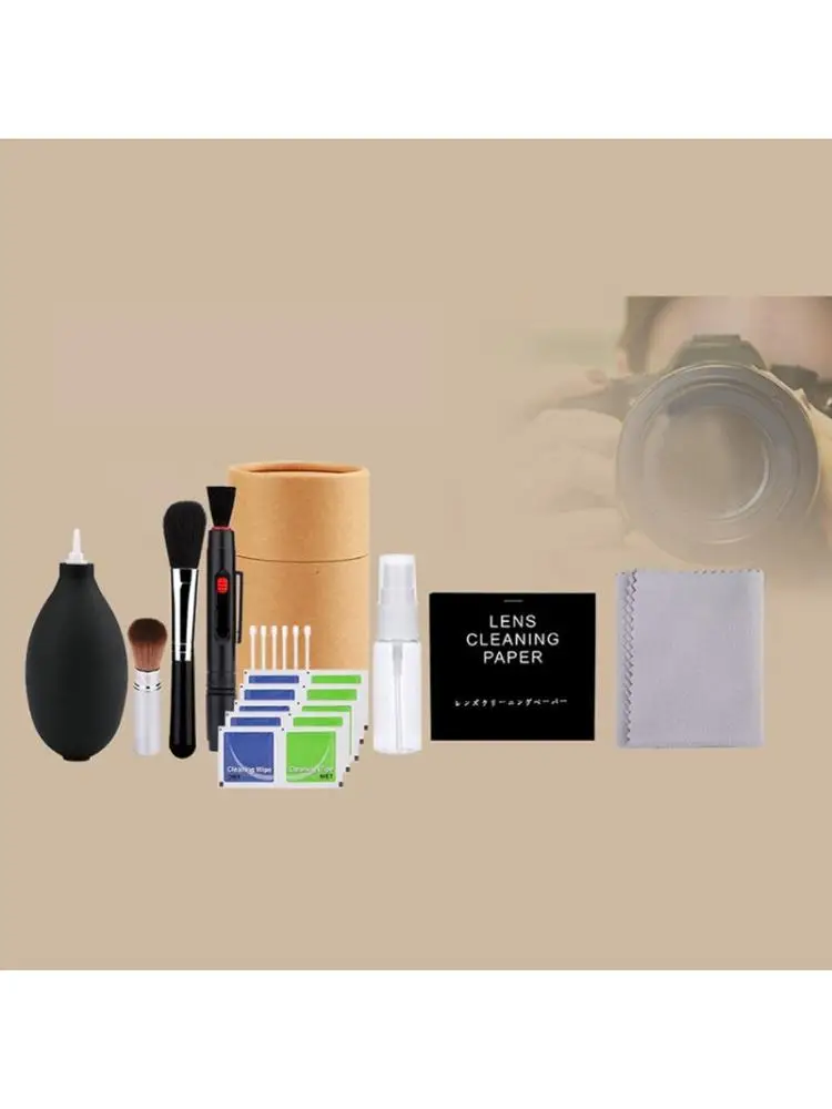 Что вы получите: 1 пылеуловитель, 1 Двусторонняя ручка, 1 чистящая щетка, 1 пустая бутылка, 1 косметическая щетка, 1 Цилиндрическая Коробка для хранения, 1 бумага для чистки линз, 6 шт ватные тампоны, 5 шт Салфетки для сухой чистки/влажные салфетки, 1 шт. салфетка для очистки линз.