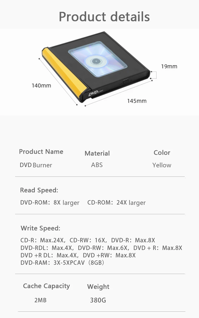 Внешний CD/DVD диск для записи и чтения может использоваться для установки программного обеспечения, воспроизведения фильмов и музыки, резервного копирования данных, просмотра обучающего видео и записи ваших драгоценных воспоминаний и сохранения фотографий. Вы можете наслаждаться повседневной жизнью с помощью этого внешнего диска.