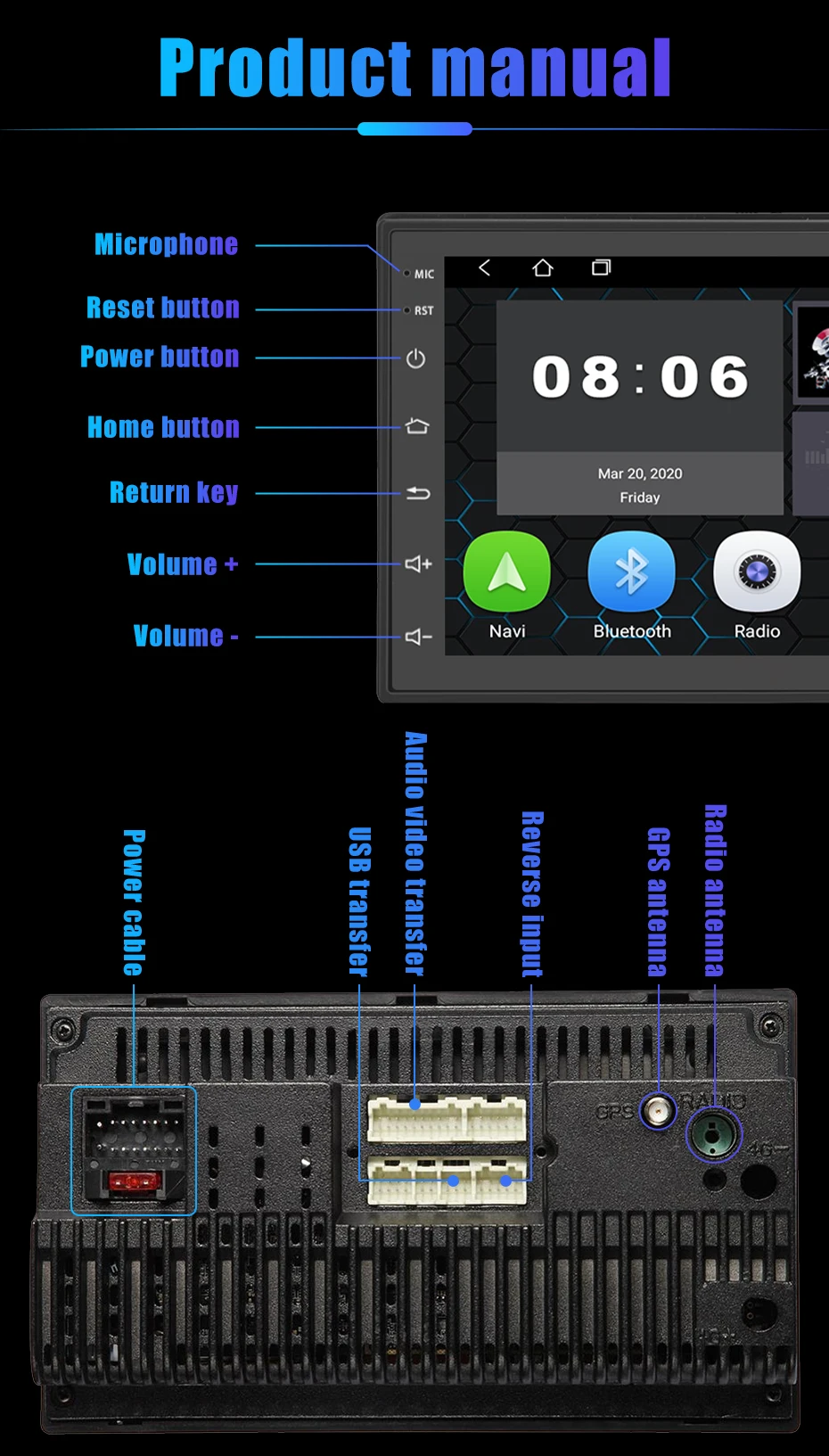 1. Четыре/четырехъядерный + android 8.1 система + Функция мобильного соединения + функция GPS + Функция Интернета + Функция AM/FM/видео выхода + беспроводная + Функция рулевого колеса + Встроенный микрофон + двойные изоляционные слои