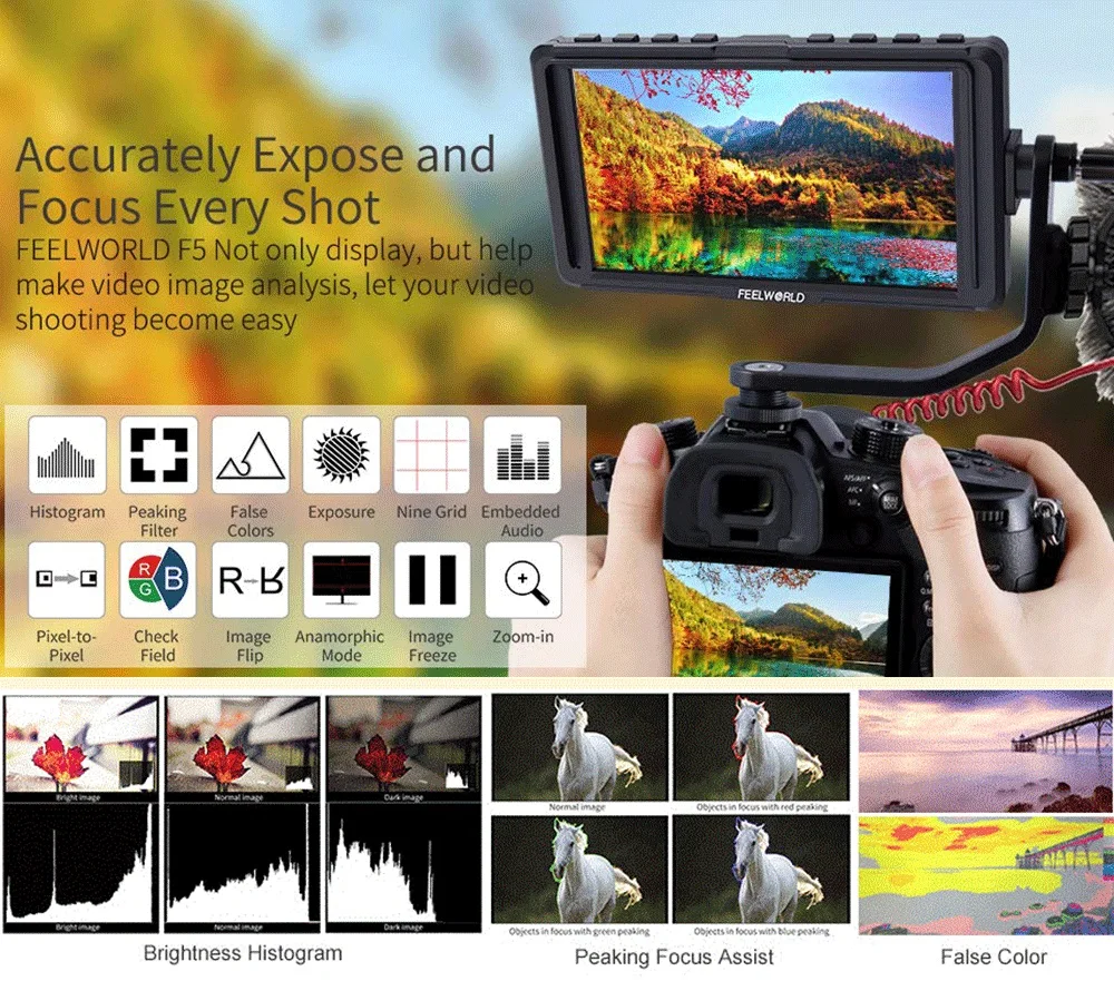 Полевой монитор FEELWORLD 5 ''F5 4K HDMI универсален и прост в использовании монитора на камере, что помогает оператору камеры (или помощнику) фокусировать камеру. С профессиональными функциями (например, гистограмма, фокусировка, встроенное аудио, Ложные цвета, воздействие зебры, маркер, анаморфный режим и т. д.), он может стать отличным компаньоном для вашей видеокамеры и чрезвычайно полезен для ваших съемок.