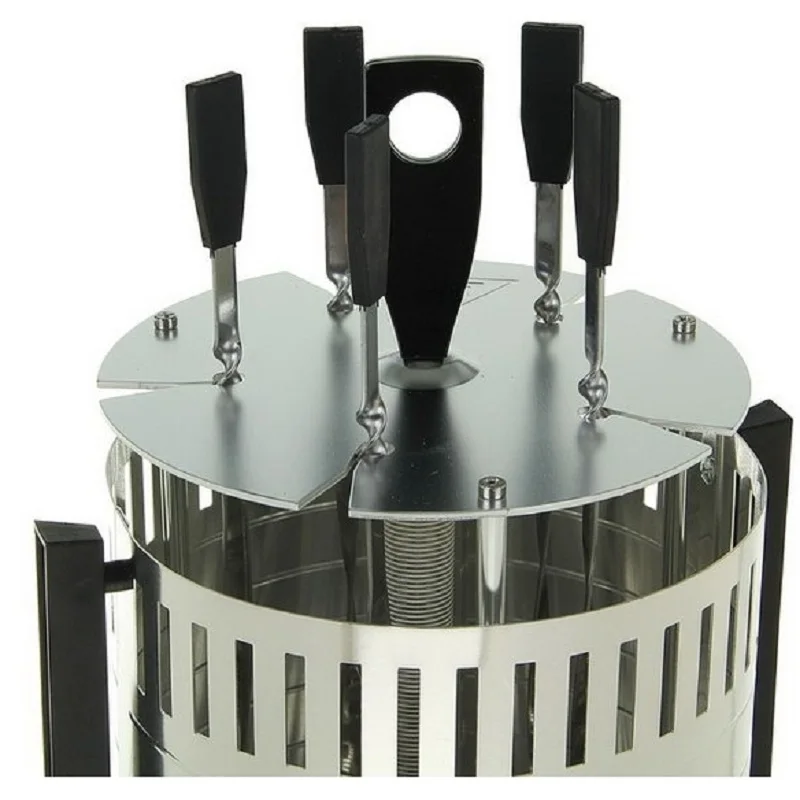 Отличная классическая модель шампуров для домашнего использования. Этот электрический шашлыхница хорош, потому что он быстро нагревается до нужной температуры, а также очень легкий и компактный, что позволяет хранить его в любом месте. Книга рецептов в подарок. 5 шт шампура из нержавеющей стали