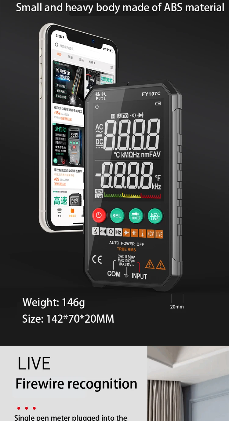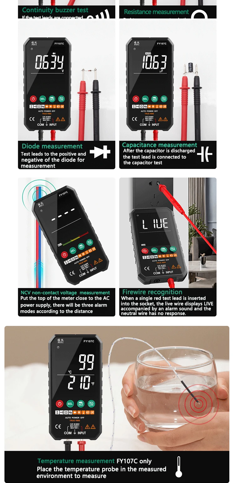 3. Измерение температуры. Самая низкая температура измерения может достигать-20 ℃(-4 ℉), самая высокая может достигать 1000 ℃(1832 ℃). (Только для FY107C)