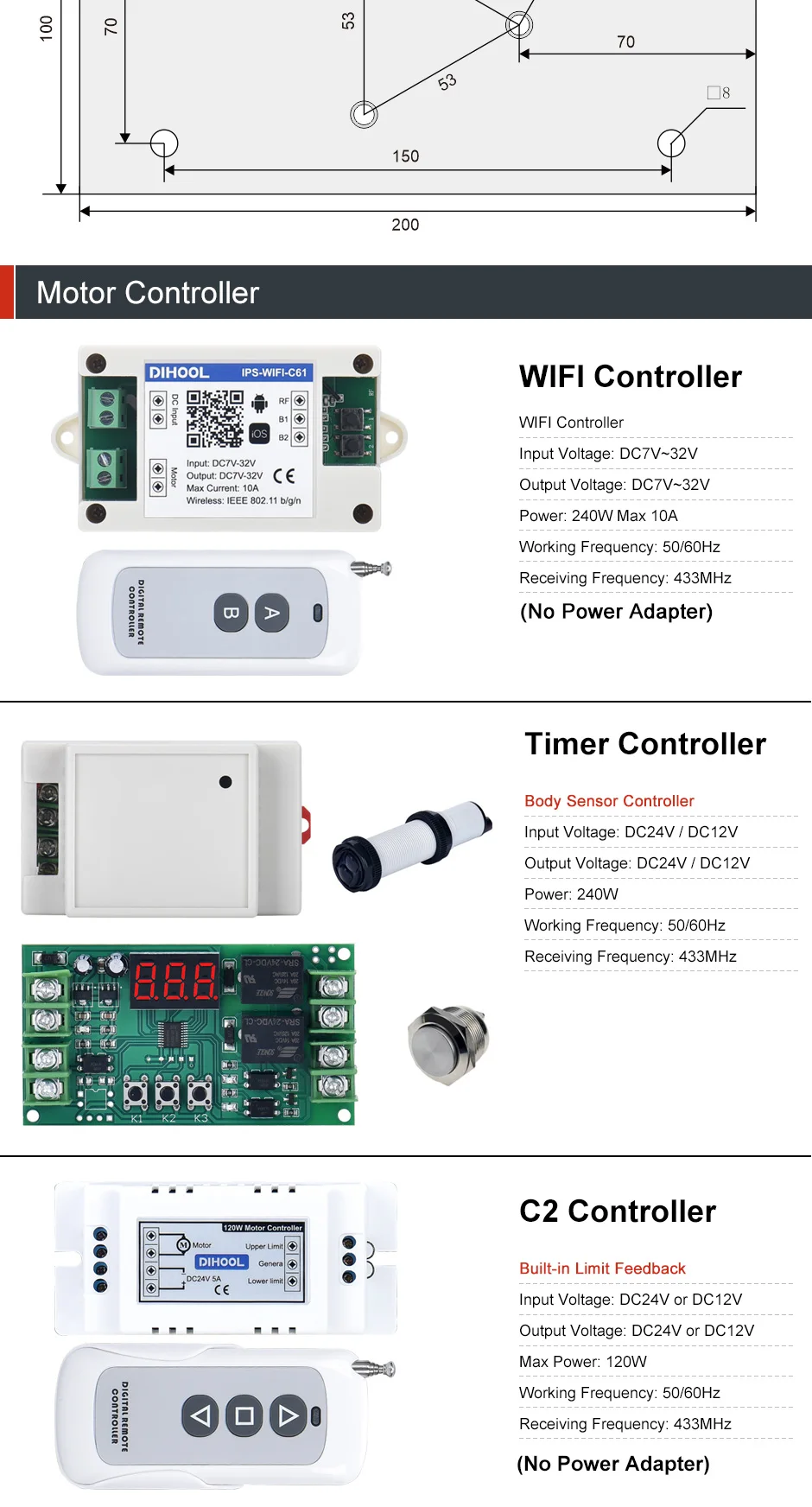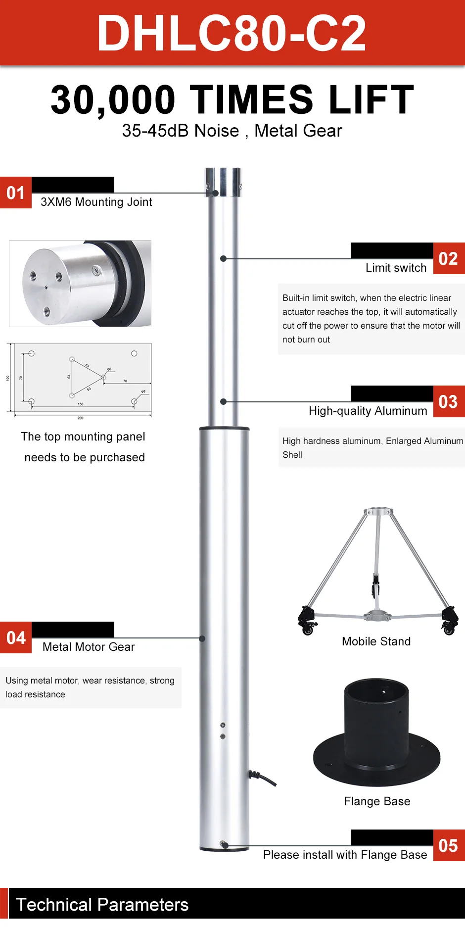 DHLC80 2 секции/3 секции цилиндрическая электрическая подъемная колонна, цилиндрический алюминиевый корпус наружный диаметр 80 мм/60 мм, 2 секции круговой колонны Диапазон хода 200-800 мм, 3 секции круговой колонны Диапазон хода 2400-1600 мм, верхняя часть колонны имеет 3 * M8 резьбовое отверстие, также может быть установлен с плоской пластиной, нижняя часть встроена для установки, Может быть оснащен треугольным кронштейном с универсальными колесами, входное напряжение-DC12V/DC24V, максимальная грузоподъемность-150 кг, максимальная скорость-36 мм/сек., встроенный концевой выключатель, когда он достигает вершины, он автоматически отключится, чтобы предотвратить работу блокированного ротора, и механизм самофиксации не сползает после выключения питания. Корпус из алюминиевого сплава принимает пескоструйную и окислительную обработку, красивый внешний вид