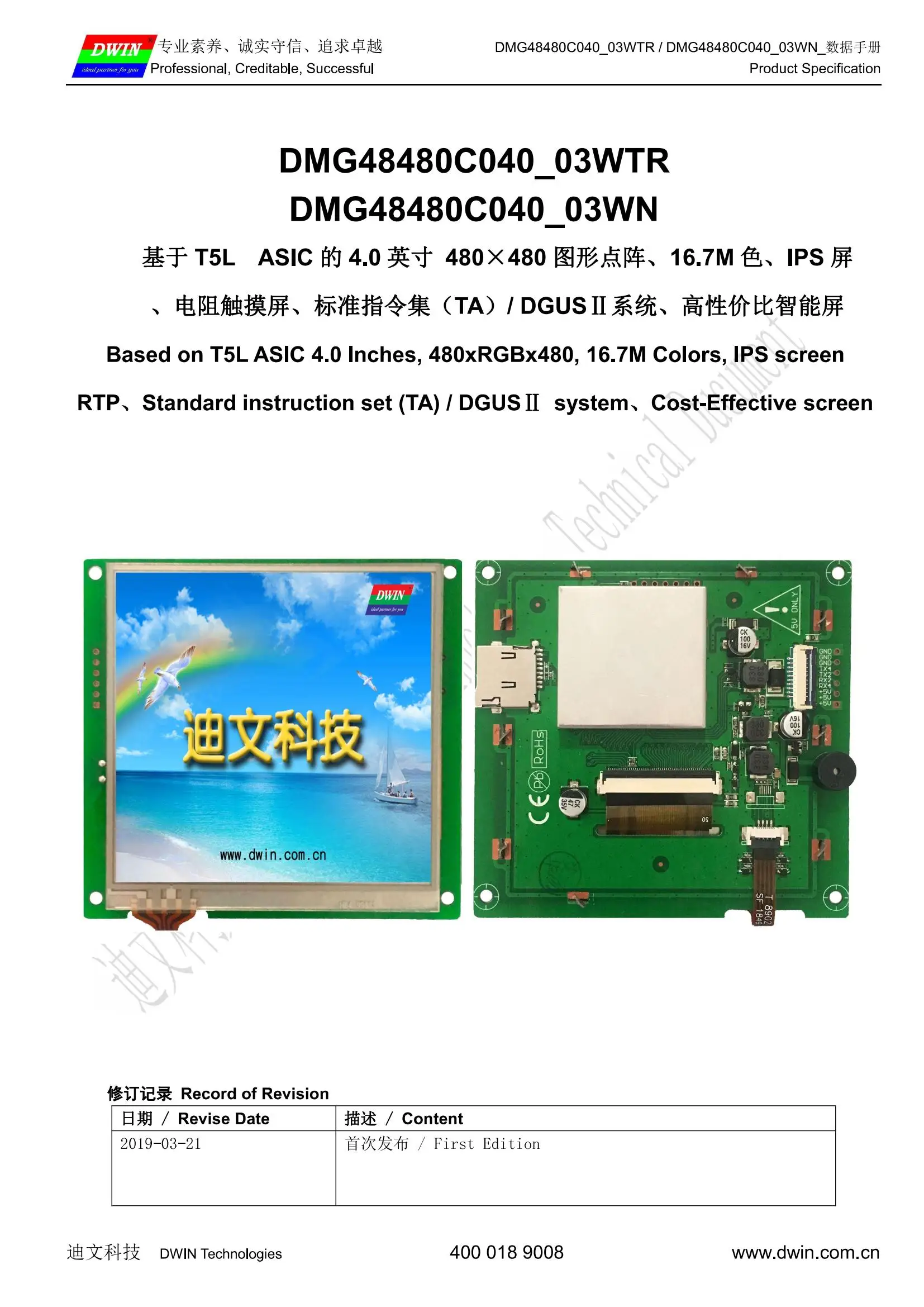 Исходя из T5L 4,0 дюймов, 480*480,IPS TFT LCM, широкий угол обзора, Стандартный набор команд (TA)/DGUSII системы, экономически эффективным. DGUS и DWIN OS (вы можете гибко спроектировать интерфейс экрана, ОС DWIN используется для вторичной разработки экрана) работают на отдельных 8051 ядер. Цикл DGUS может быть таким же коротким, как 20 мс, и любая машина Чрезвычайно гладкая.