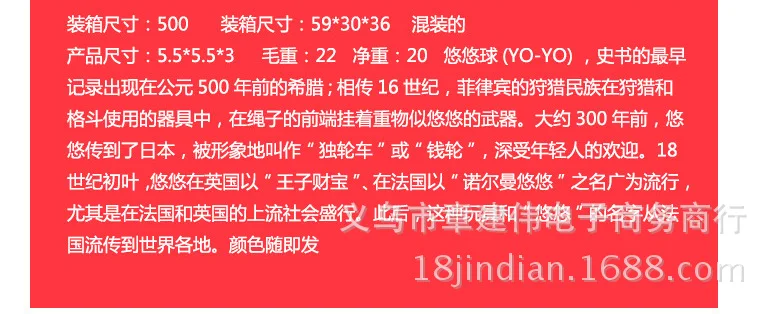 Йо-Йо (YO-YO), самая ранняя запись в истории книги появились в Греции до 500 AD; Согласно легенде, в XVI века, среди охотничьего и боевого оборудования, используемого филиппинскими охотниками, передний конец веревки повесил тяжелые предметы, которые выглядели как оружие. Около 300 лет назад Yoyo был представлен в Японии и был ярко назван «тачка» или «колесо денег» и был очень популярен среди молодежи. В начале 18-го века Yoyo пользуется популярностью в Великобритании как «сокровище принца» и во Франции как «Норман йо», особенно во Франции и Великобритании. С тех пор название этой игрушки и "Yoyou" изменили Францию по всему миру. Цвет сразу же высвобождается