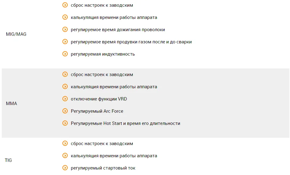 Три полноценных режима сварки: MIG/MAG, MMA и TIG, в каждом режиме широкий