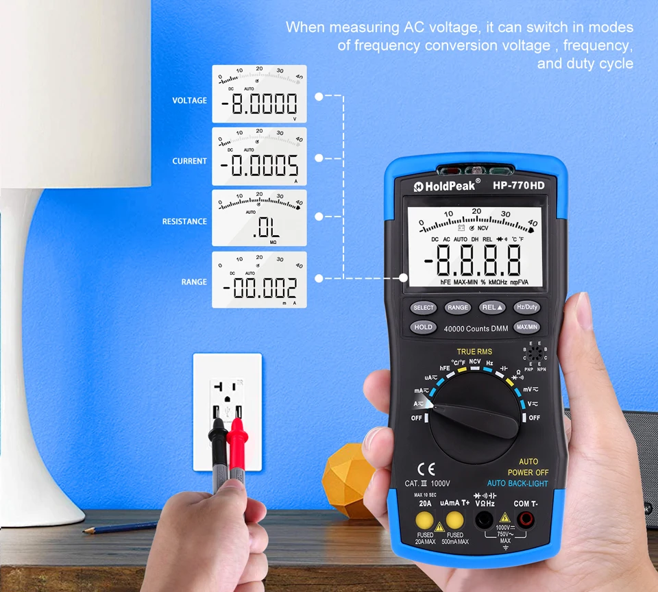 Высокоточный и высокопроизводительный HP-770HD может измерять напряжение переменного/постоянного тока, ток переменного/постоянного тока, сопротивление, емкость, частоту и рабочий цикл.