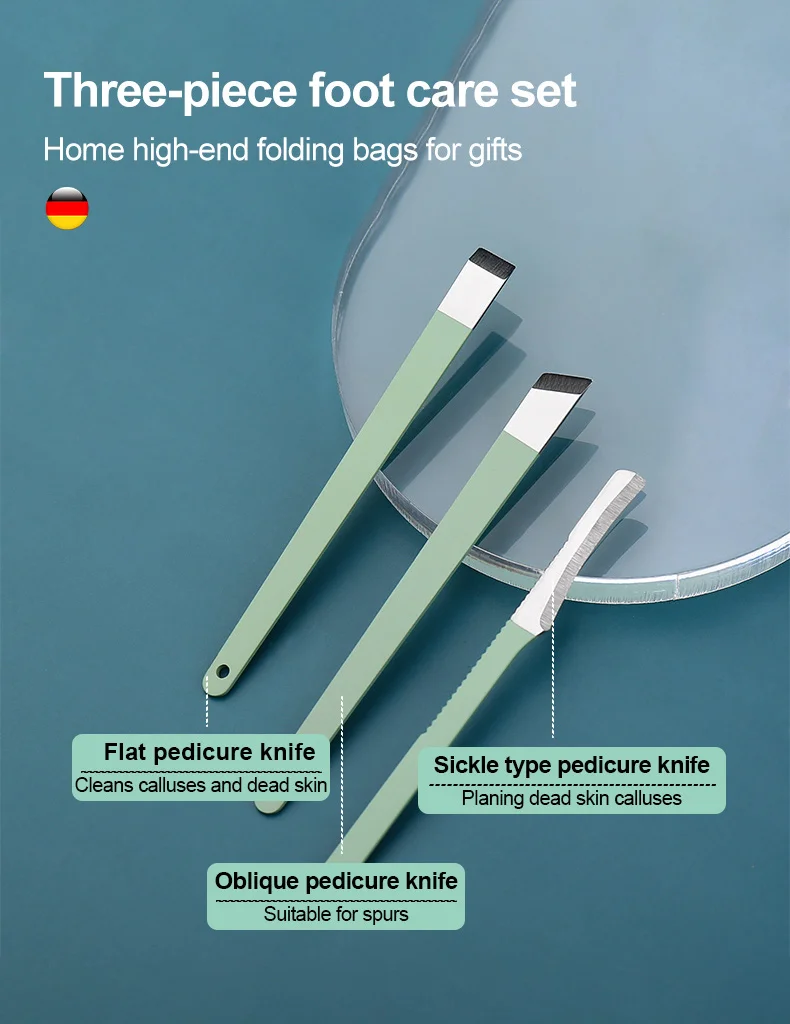 3. Уход за руками: маленькие кусачки для ногтей, косая Кусачка для ногтей, пилочки для ногтей, остроконечные пики, плоская лопатка, v-образная вилка для мертвой кожи.