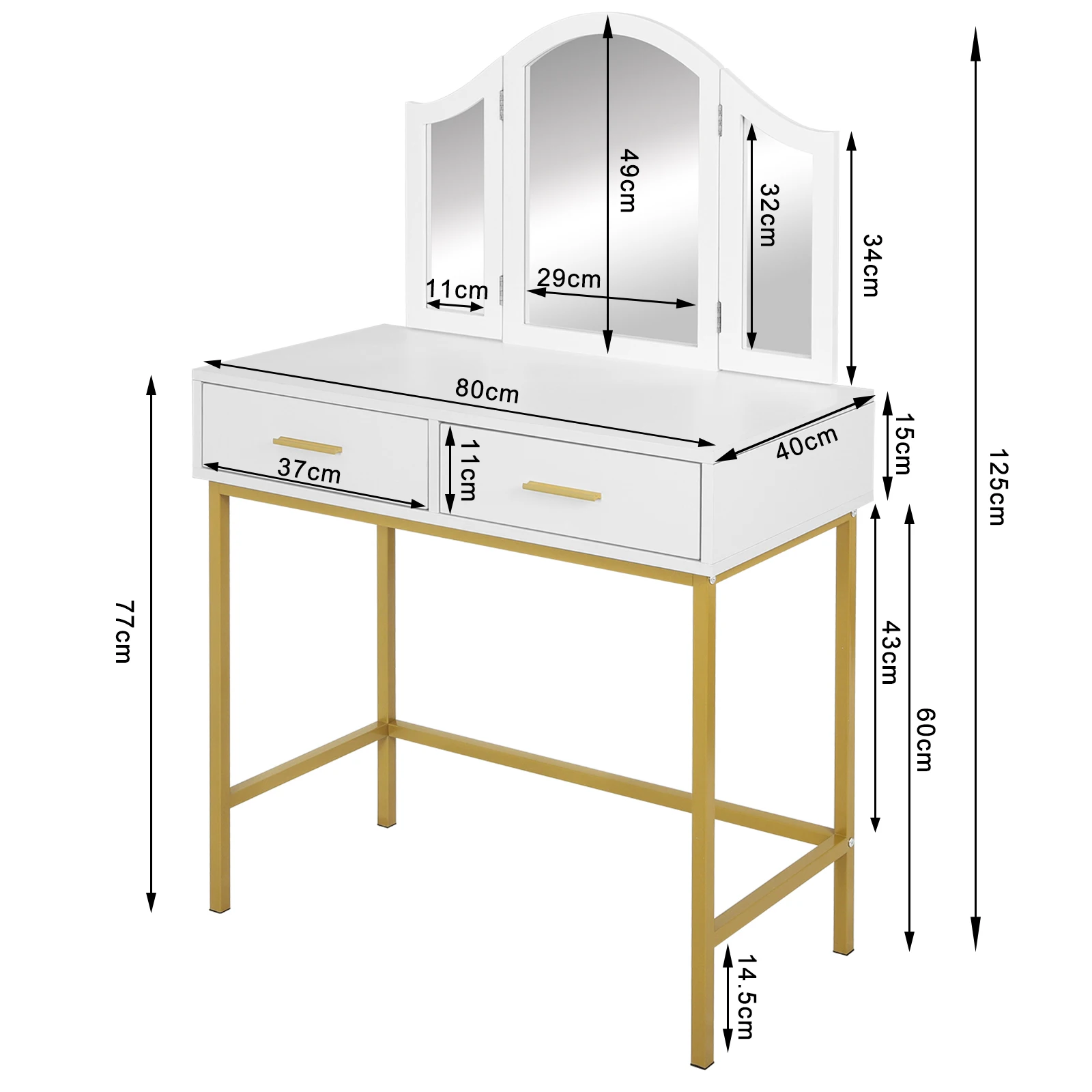 Детали качества: углы и края туалетного столика гладкие и без заусенцев. 2 ящика обеспечивают пространство для ваших повседневных вещей, бесшумные металлические направляющие и металлические ручки делают ящики простыми в использовании. Железные перекрещивающиеся скобы, соединенные с ножками стола, повышают стабильность. На задней панели есть защита от наклона, которую вы должны прикрепить к стене для дальнейшего повышения стабильности
