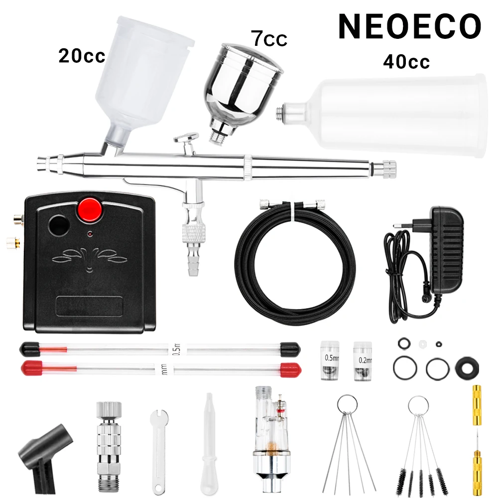 Включает в себя портативный воздушный компрессор, воздушный шланг, Отсоединяемый двойного действия гравитационный питательный Аэрограф, 7cc стаканчик жидкости, 20cc стаканчик жидкости, 40cc стаканчик жидкости, Быстроразъемное соединение, мини воздушный фильтр, держатель, сопло гаечный ключ и капельница, 6 шт набор уплотнительных колец.