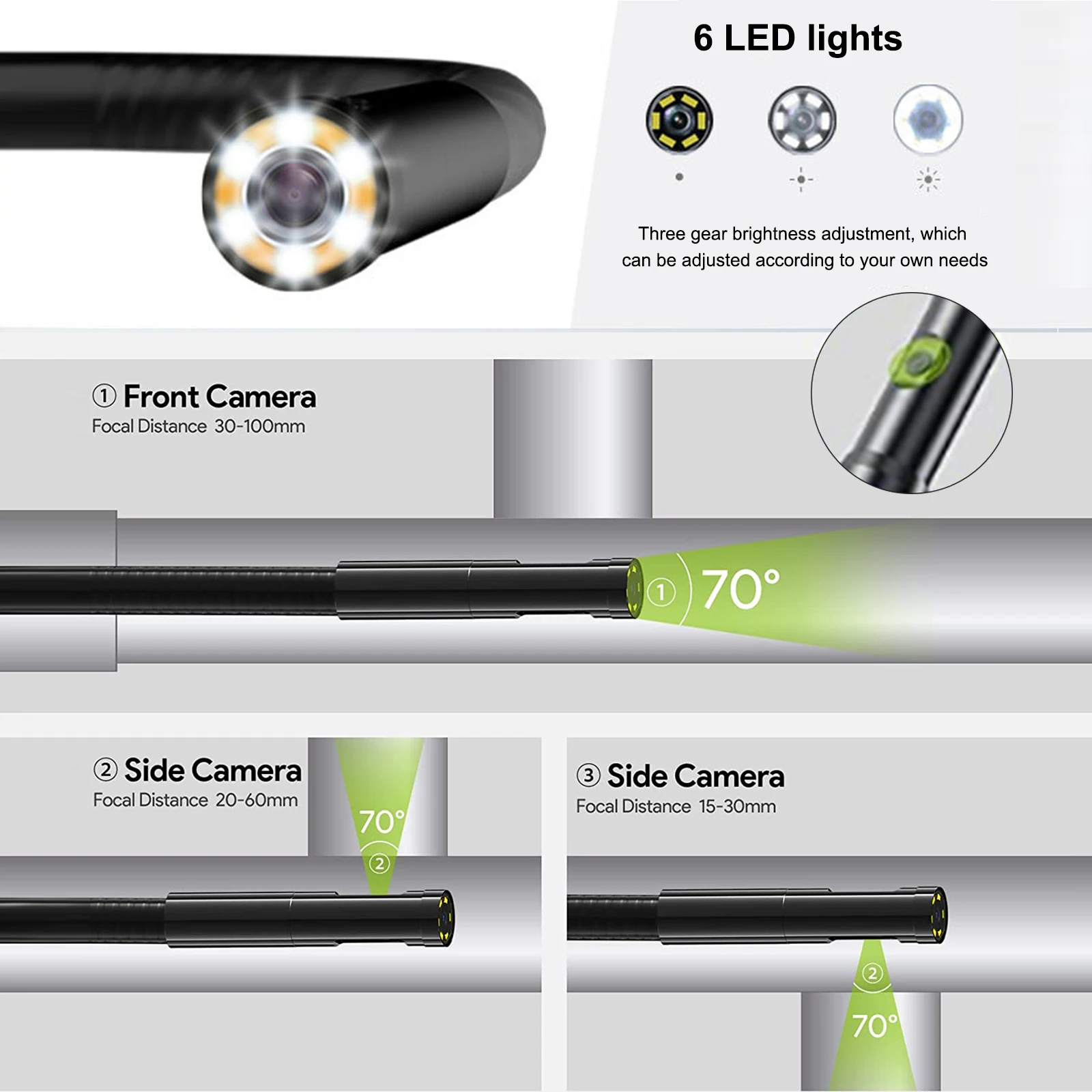 1. Три линзы: эндоскоп имеет три линзы, кнопка переключения камеры встроена в кабель, и боковую камеру можно включить, чтобы создать больше углов обзора. Вы можете конвертировать три кадра по своему желанию, применять их к различным сценам и видеть более четко.Линия передачи данных * 1