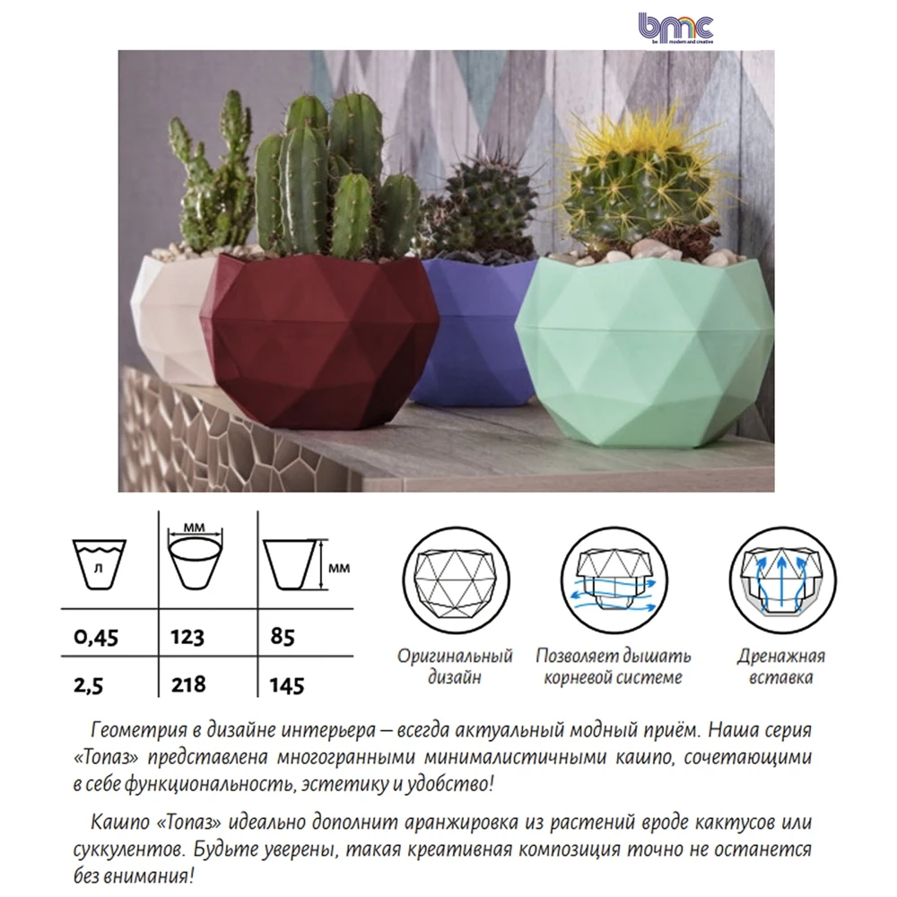 Геометрия в дизайне интерьера - всегда актуальный модный прием. Серия «Топаз» представлена многогранными минималистичными кашпо, сочетающими в себе функциональность, эстетику и удобство! Кашпо «Топаз» идеально дополнит аранжировка из растений вроде кактусов или суккулентов. Будьте уверены, такая креативная композиция точно не останется без внимания! Коллекция "Топаз" выполненная в ярких трендовых оттенках, поможет внести в свой интерьер разнообразие.