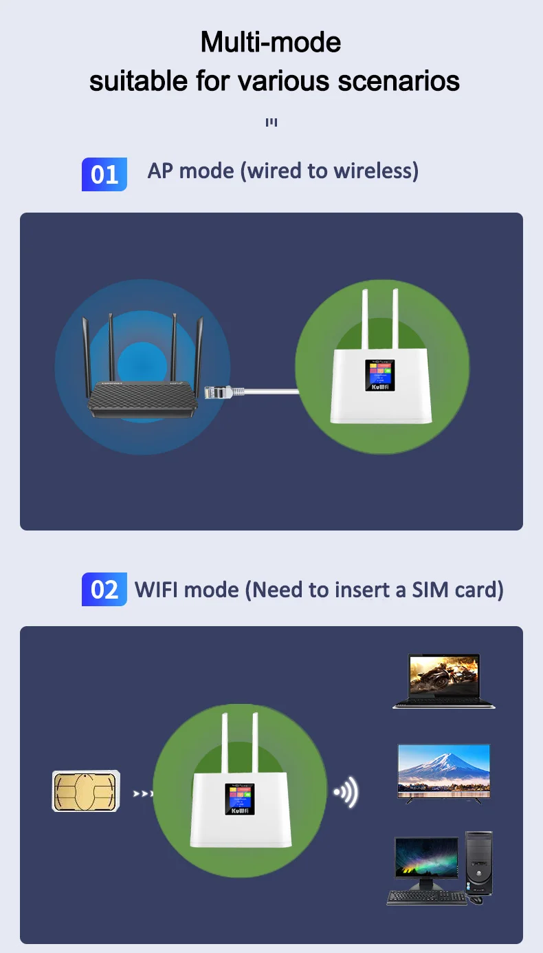 -- Антенна с высоким коэффициентом усиления: маршрутизатор поставляется с 2 внешними антеннами, которые могут увеличить сигнал 4G.