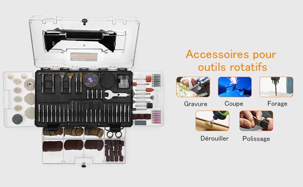 Посылка:10 * шлифовальные ленты (большие)20 * шлифовальные ленты (маленькие)2 * тканевое колесо4 * войлочное колесо (большое)8 * войлочное колесо (Маленькое)2 * точка колеса из войлока1 * резиновое колесо4 * полированные сверла из быстрорежущей стали2 * шлифовальные шкуры8 * алмазные фрезы3 * HSS фрезы3 * алюм. Оксид шлифовальные круги с хвостовиком6 * алюм. Оксид шлифовальные круги3 * Карбид Кремния шлифовальные круги с хвостовиком6 * шлифовальные круги из карбида кремния1 * твердосплавный выделочный камень4 * Резиновые шлифовальные круги с хвостовиком3 * щетки из нержавеющей стали3 * латунная щетка1 * Полировочная смесь108 * обычные отрезные колеса2 * отрезные колеса из стекловолокна135 * шлифовальные диски4 * хромированные коллеты1 * оправка для войлочного колеса2 * оправка для отрезного колеса1 * оправка для тканевого колеса1 * шлифовальный круг1 * гаечный ключ1 * чехол для хранения