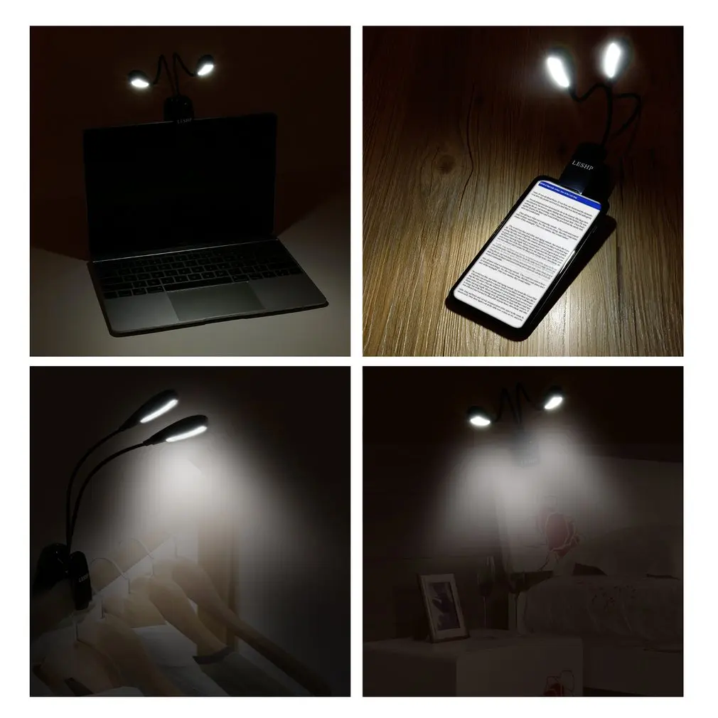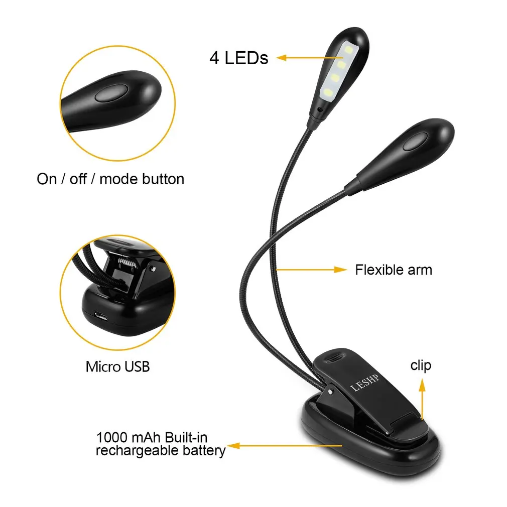 LESHP 8LED книжный светильник с двойным полюсом, зажимом на музыкальной подставке, светильник с перезаряжаемой регулируемой яркостью, встроенный аккумулятор 1000 мАч