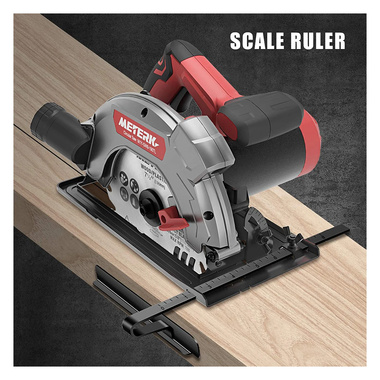Meterk circular saw is equipped with a laser device and comes with a scale ruler, which will help straight cuts be more vertical and cut more precise. The laser device is integrated with the entire circular saw, so it can be used without installing a battery. The laser can be turned on with one button if need it, which is more convenient for users to do straight, precise and professional Cutting.