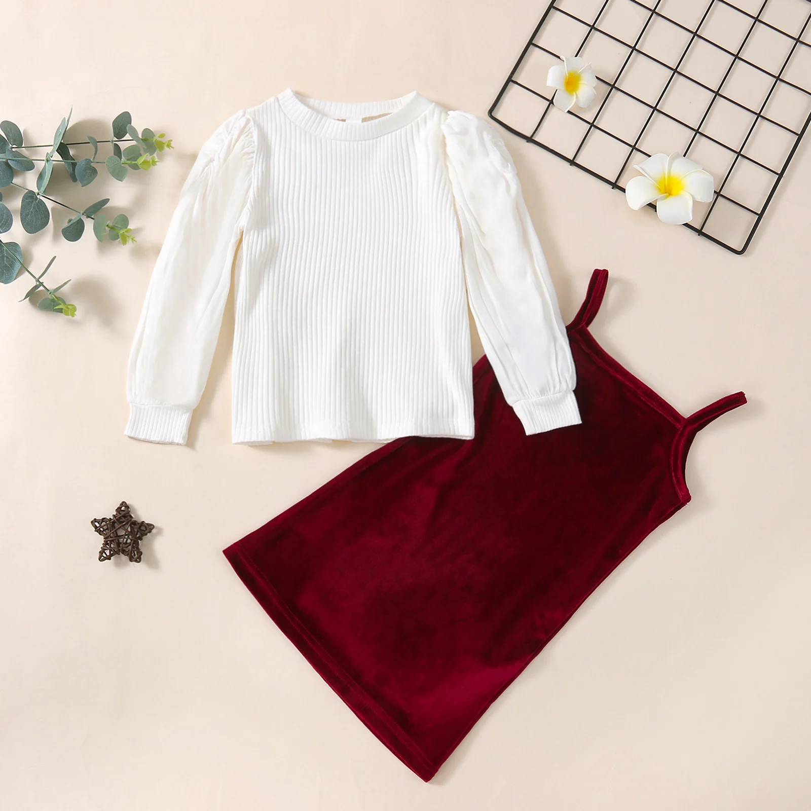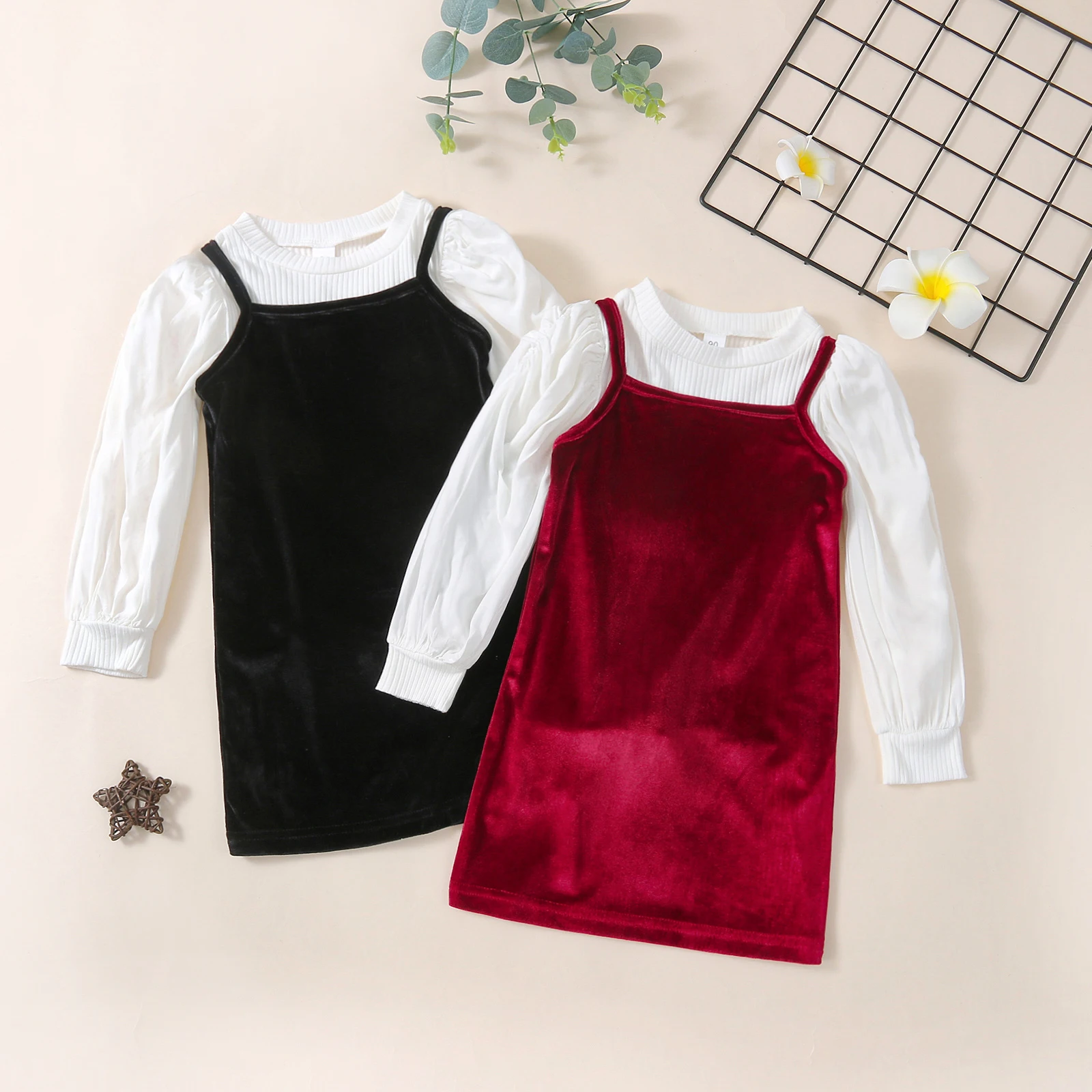 Модная Однотонная футболка и платье на подтяжках для маленьких девочек; Комплект из двух предметов; Идеальный костюм с юбкой сделает вашу девочку осенней освежающей и удобной, полной энергии и энергии. Этот повседневный костюм из топа с длинными рукавами и юбки трапециевидной формы идеально подходит для детского дня рождения.